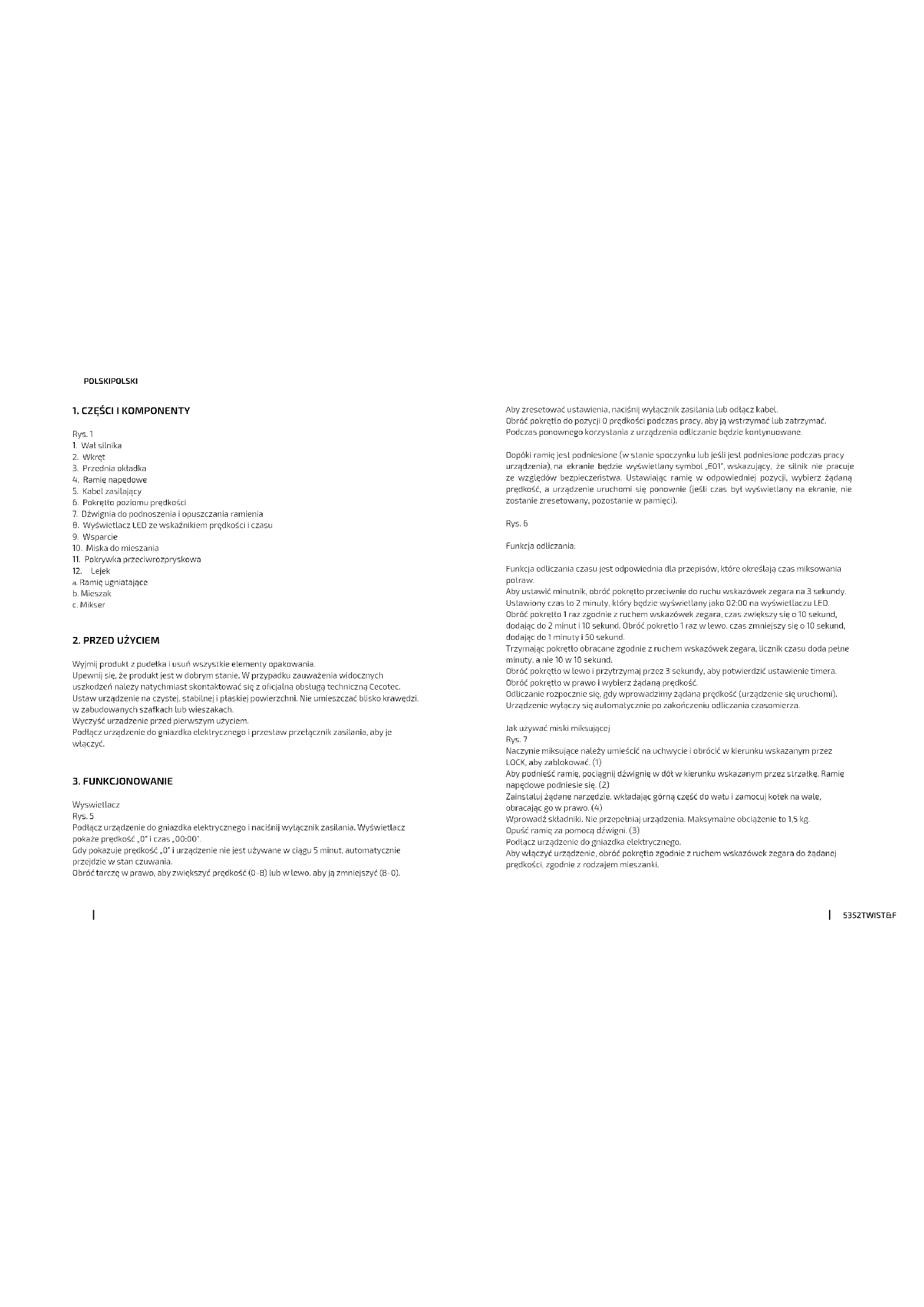 A diretiva europeia 2012/19/UE sobre Resíduos de Aparelhos Elétricos e Eletrónicos (RAEE) especica que os eletrodomésticos não devem ser reciclados com o resto dos resíduos municipais. Ditos eletrodomésticos terão de ser eliminados de forma separada, para otimizar a recuperação e reciclagem de materiais e, desta maneira, reduzir o impacto que possam ter na saúde humana e no meio ambiente. O símbolo do contentor riscado recorda a sua obrigação de eliminar este produto de forma correta. Se o produto em questão conta com uma bateria ou pilha para a sua autonomia elétrica, esta deverá extrair-se antes de ser eliminado e ser tratada à parte como um resíduo de diferente categoria. Para obter informação detalhada acerca da forma mais adequada de eliminar os seus eletrodomésticos e/ou as correspondentes baterias, o consumidor deverá contactar com as autoridades locais.5352 TWIST&FUSION 4000 LUXURYTWIST&FUSION 4000 LUXURY POLSKI POLSKI Aby zresetować ustawienia, naciśnij wyłącznik zasilania lub odłącz kabel. Obróć pokrętło do pozycji 0 prędkości podczas pracy, aby ją wstrzymać lub zatrzymać. Podczas ponownego korzystania z urządzenia odliczanie będzie kontynuowane. Dopóki ramię jest podniesione (w stanie spoczynku lub jeśli jest podniesione podczas pracy urządzenia), na ekranie będzie wyświetlany symbol „E01”, wskazujący, że silnik nie pracuje ze względów bezpieczeństwa. Ustawiając ramię w odpowiedniej pozycji, wybierz żądaną prędkość, a urządzenie uruchomi się ponownie (jeśli czas był wyświetlany na ekranie, nie zostanie zresetowany, pozostanie w pamięci). Rys. 6 Funkcja odliczania: Funkcja odliczania czasu jest odpowiednia dla przepisów, które określają czas miksowania potraw. Aby ustawić minutnik, obróć pokrętło przeciwnie do ruchu wskazówek zegara na 3 sekundy. Ustawiony czas to 2 minuty, który będzie wyświetlany jako 02:00 na wyświetlaczu LED. Obróć pokrętło 1 raz zgodnie z ruchem wskazówek zegara, czas zwiększy się o 10 sekund, dodając do 2 minut i 10 sekund. Obróć pokrętło 1 raz w lewo, czas zmniejszy się o 10 sekund, dodając do 1 minuty i 50 sekund. Trzymając pokrętło obracane zgodnie z ruchem wskazówek zegara, licznik czasu doda pełne minuty, a nie 10 w 10 sekund. Obróć pokrętło w lewo i przytrzymaj przez 3 sekundy, aby potwierdzić ustawienie timera. Obróć pokrętło w prawo i wybierz żądaną prędkość. Odliczanie rozpocznie się, gdy wprowadzimy żądaną prędkość (urządzenie się uruchomi). Urządzenie wyłączy się automatycznie po zakończeniu odliczania czasomierza. Jak używać miski miksującej Rys. 7 Naczynie miksujące należy umieścić na uchwycie i obrócić w kierunku wskazanym przez LOCK, aby zablokować. (1) Aby podnieść ramię, pociągnij dźwignię w dół w kierunku wskazanym przez strzałkę. Ramię napędowe podniesie się. (2) Zainstaluj żądane narzędzie, wkładając górną część do wału i zamocuj kołek na wale, obracając go w prawo. (4) Wprowadź składniki. Nie przepełniaj urządzenia. Maksymalne obciążenie to 1,5 kg. Opuść ramię za pomocą dźwigni. (3) Podłącz urządzenie do gniazdka elektrycznego. Aby włączyć urządzenie, obróć pokrętło zgodnie z ruchem wskazówek zegara do żądanej prędkości, zgodnie z rodzajem mieszanki.