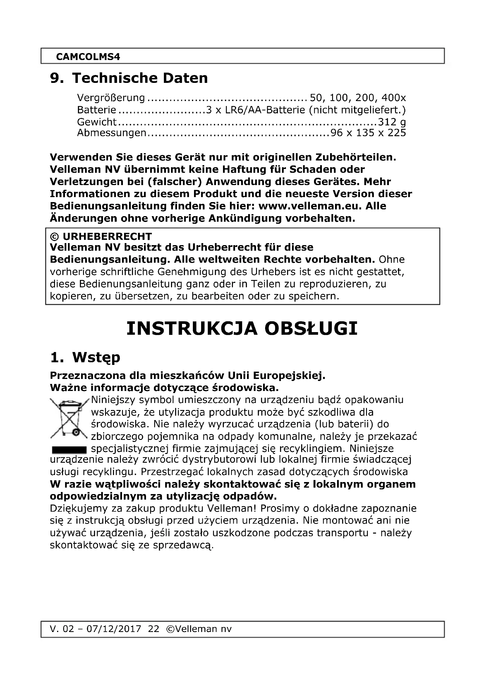 Przeznaczona dla mieszkańców Unii Europejskiej. Ważne informacje dotyczące środowiska. Niniejszy symbol umieszczony na urządzeniu bądź opakowaniu wskazuje, że utylizacja produktu może być szkodliwa dla środowiska. Nie należy wyrzucać urządzenia (lub baterii) do zbiorczego pojemnika na odpady komunalne, należy je przekazać specjalistycznej firmie zajmującej się recyklingiem. Niniejsze urządzenie należy zwrócić dystrybutorowi lub lokalnej firmie świadczącej usługi recyklingu. Przestrzegać lokalnych zasad dotyczących środowiska W razie wątpliwości należy skontaktować się z lokalnym organem odpowiedzialnym za utylizację odpadów. Dziękujemy za zakup produktu Velleman! Prosimy o dokładne zapoznanie się z instrukcją obsługi przed użyciem urządzenia. Nie montować ani nie używać urządzenia, jeśli zostało uszkodzone podczas transportu - należy skontaktować się ze sprzedawcą.CAMCOLMS4
