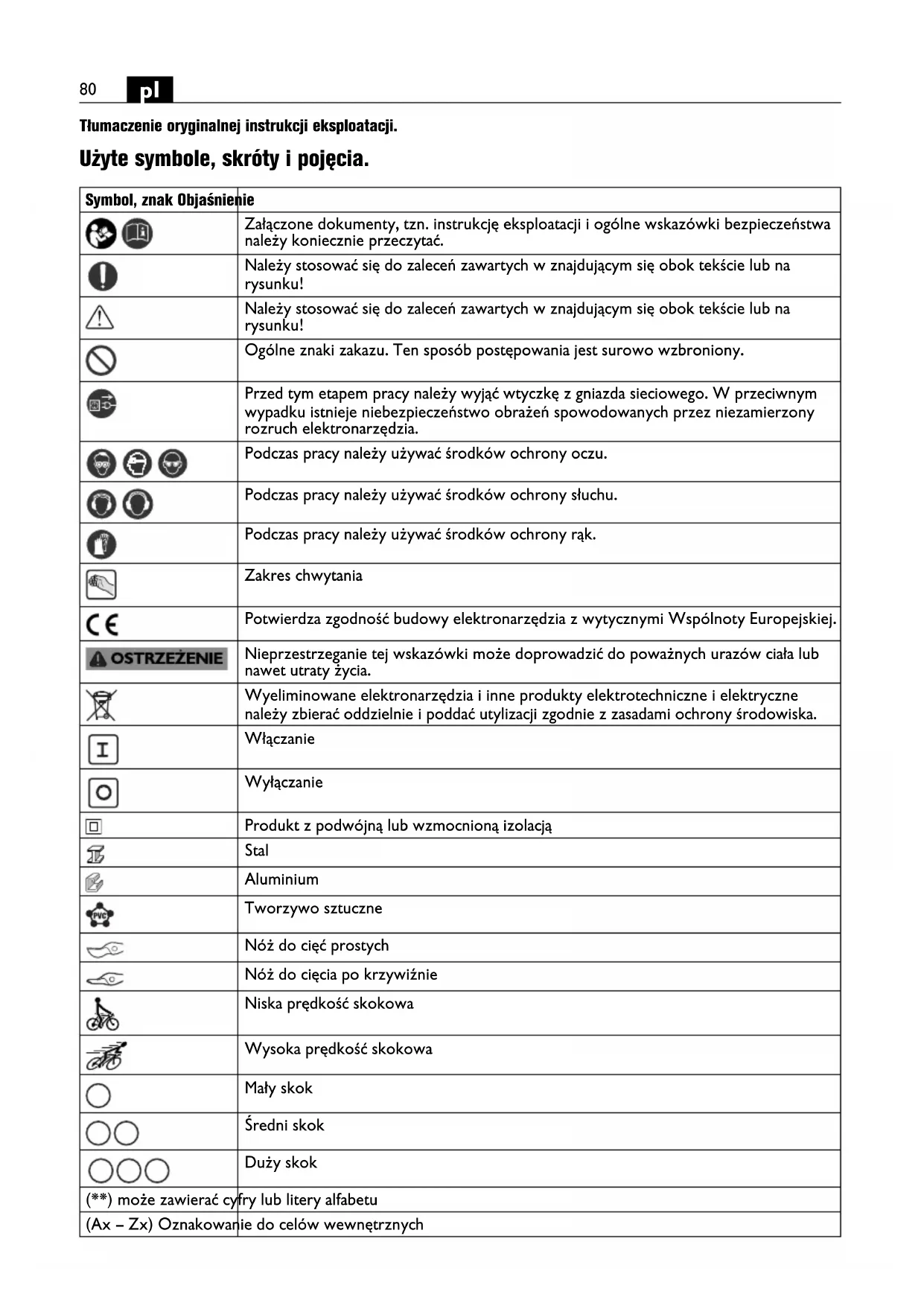 Tłumaczenie oryginalnej instrukcji eksploatacji. Użyte symbole, skróty i pojęcia. Symbol, znak Objaśnienie Załączone dokumenty, tzn. instrukcję eksploatacji i ogólne wskazówki bezpieczeństwa należy koniecznie przeczytać. Należy stosować się do zaleceń zawartych w znajdującym się obok tekście lub na rysunku! Należy stosować się do zaleceń zawartych w znajdującym się obok tekście lub na rysunku! Ogólne znaki zakazu. Ten sposób postępowania jest surowo wzbroniony. Przed tym etapem pracy należy wyjąć wtyczkę z gniazda sieciowego. W przeciwnym wypadku istnieje niebezpieczeństwo obrażeń spowodowanych przez niezamierzony rozruch elektronarzędzia. Podczas pracy należy używać środków ochrony oczu. Podczas pracy należy używać środków ochrony słuchu. Podczas pracy należy używać środków ochrony rąk. Zakres chwytania Potwierdza zgodność budowy elektronarzędzia z wytycznymi Wspólnoty Europejskiej. Nieprzestrzeganie tej wskazówki może doprowadzić do poważnych urazów ciała lub nawet utraty życia. Wyeliminowane elektronarzędzia i inne produkty elektrotechniczne i elektryczne należy zbierać oddzielnie i poddać utylizacji zgodnie z zasadami ochrony środowiska. Włączanie Wyłączanie Produkt z podwójną lub wzmocnioną izolacją Stal Aluminium Tworzywo sztuczne Nóż do cięć prostych Nóż do cięcia po krzywiźnie Niska prędkość skokowa Wysoka prędkość skokowa Mały skok Średni skok Duży skok (**) może zawierać cyfry lub litery alfabetu (Ax – Zx) Oznakowanie do celów wewnętrznych81