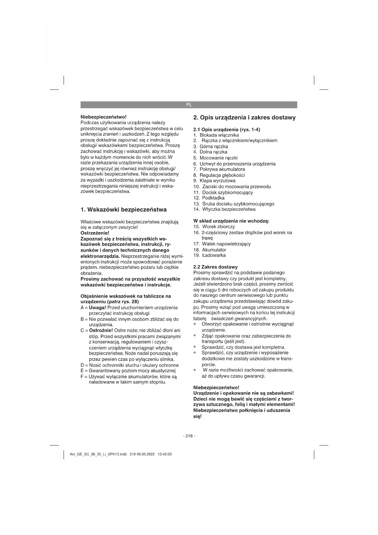 W razie możliwości zachować opakowanie, aż do upływu czasu gwarancji. Niebezpieczeństwo! Urządzenie i opakowanie nie są zabawkami! Dzieci nie mogą bawić się częściami z twor- zywa sztucznego, folią i małymi elementami! Niebezpieczeństwo połknięcia i uduszenia się! Anl_GE_SC_36_35_Li_SPK13.indb 218 08.03.2022 13:42:03PL