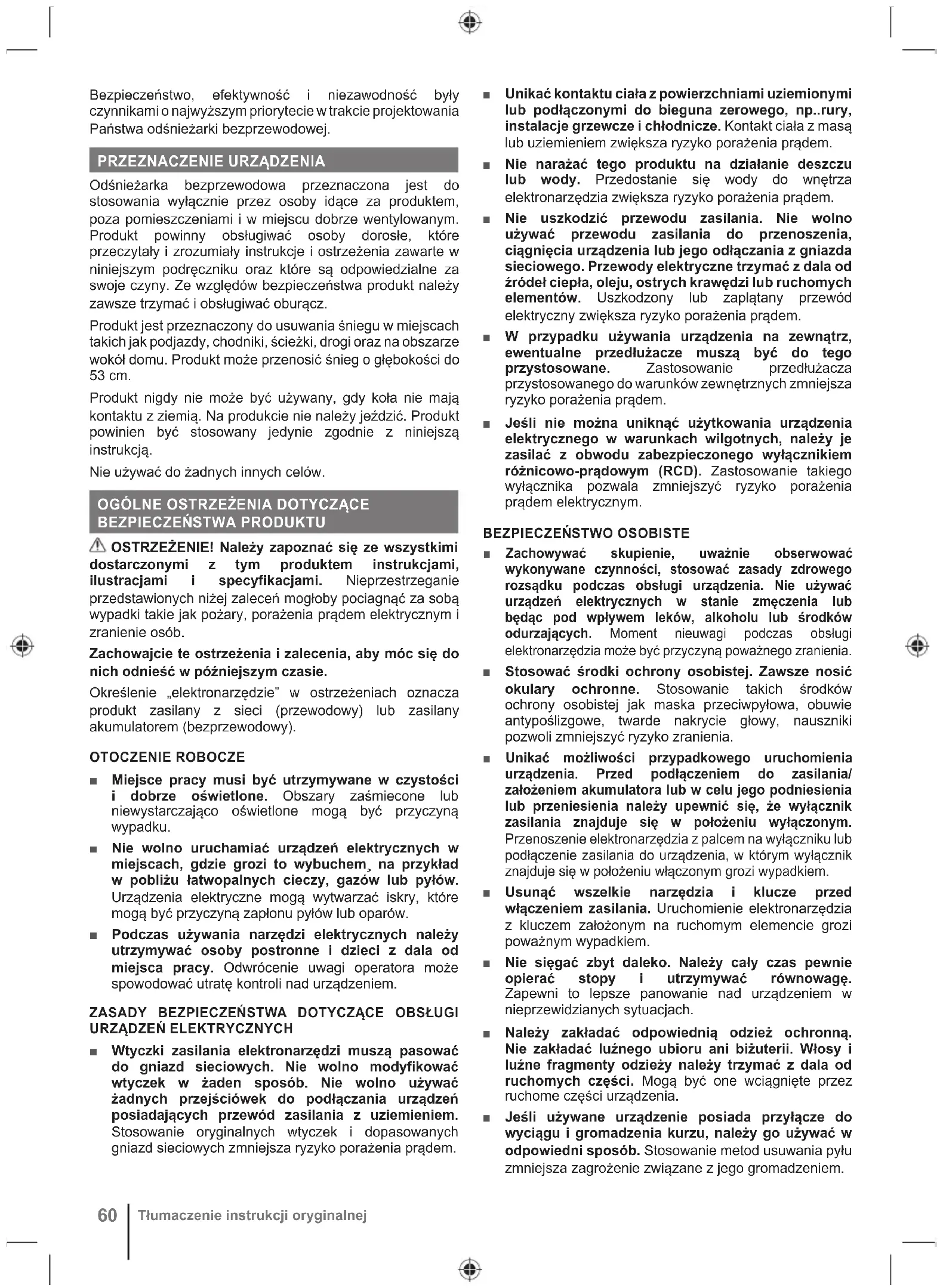 Стоп60 Tłumaczenie instrukcji oryginalnej Bezpieczeństwo, efektywność i niezawodność były czynnikami o najwyższym priorytecie w trakcie projektowania Państwa odśnieżarki bezprzewodowej.