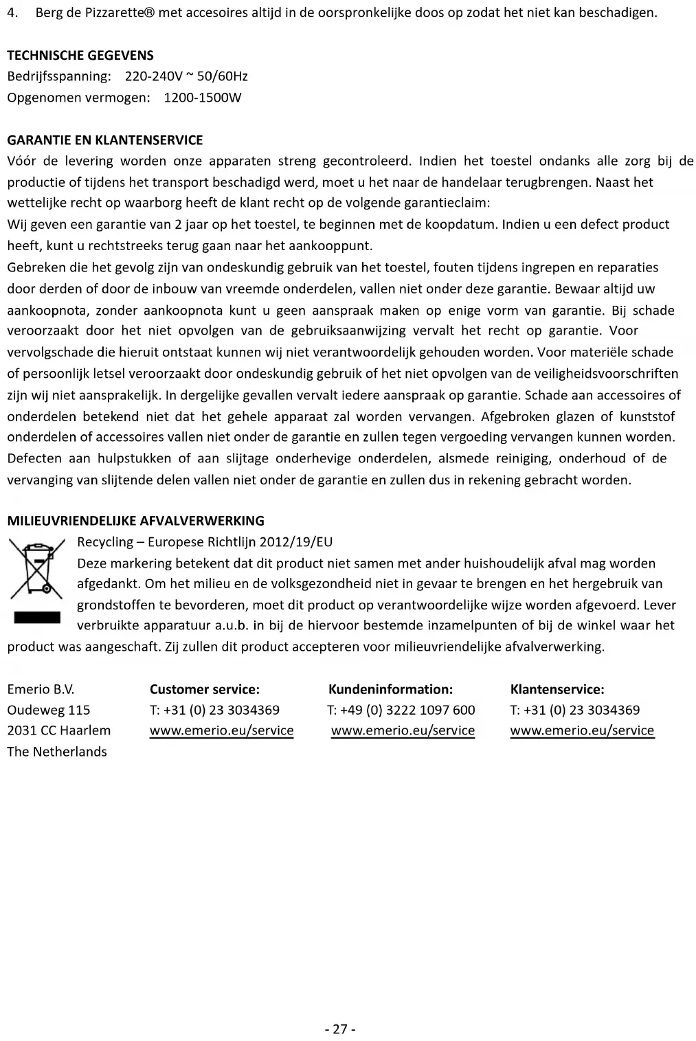 Recykling – Dyrektywa europejska nr 2012/19/UE Ten znak oznacza, że urządzenia nie należy wyrzucać razem z innymi odpadami domowymi. Aby zapobiec możliwym szkodom dla środowiska i zdrowia ludzi spowodowanym niekontrolowaną utylizacją odpadów, poddaj produkt procesowi recyklingu w celu promowania zrównoważonego ponownego wykorzystywania zasobów materiałowych. Aby zwrócić zużyte urządzenie, skorzystaj z systemu oddawania zużytych produktów lub skontaktuj się ze sprzedawcą. Sprzedawca może przyjąć produkt w celu przeprowadzenia bezpiecznego dla środowiska recyklingu. Emerio B.V. Customer service: Kundeninformation: Klantenservice: Oudeweg 115 T: +31 (0) 23 3034369 T: +49 (0) 3222 1097 600 T: +31 (0) 23 3034369 2031 CC Haarlem www.emerio.eu/service www.emerio.eu/service www.emerio.eu/service The Netherlands
