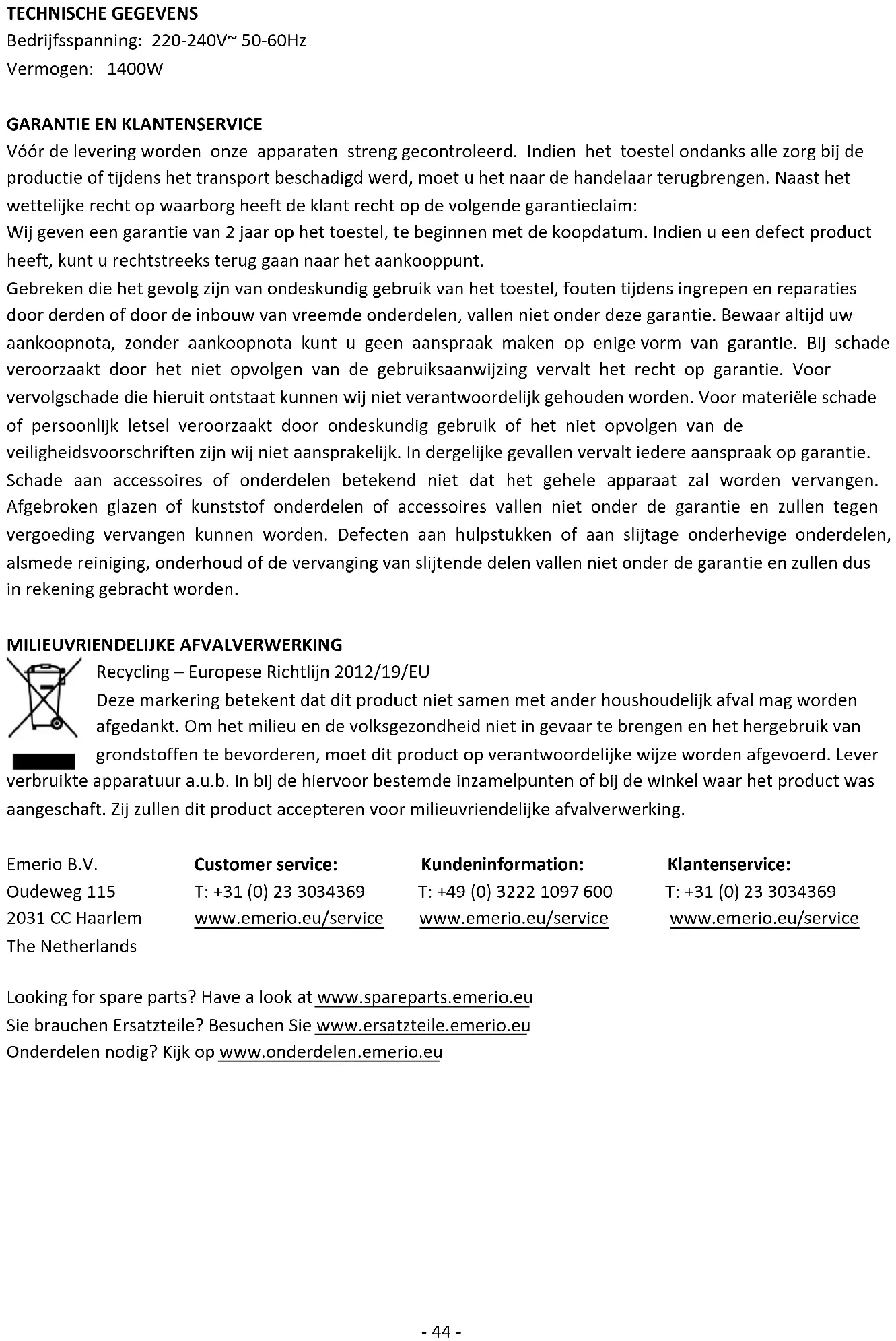 Recykling – Dyrektywa europejska nr 2012/19/UE Ten znak oznacza, że urządzenia nie należy wyrzucać razem z innymi odpadami domowymi. Aby zapobiec możliwym szkodom dla środowiska i zdrowia ludzi spowodowanym niekontrolowaną utylizacją odpadów, poddaj produkt procesowi recyklingu w celu promowania zrównoważonego ponownego wykorzystywania zasobów materiałowych. Aby zwrócić zużyte urządzenie, skorzystaj z systemu oddawania zużytych produktów lub skontaktuj się ze sprzedawcą. Sprzedawca może przyjąć produkt w celu przeprowadzenia bezpiecznego dla środowiska recyklingu. Emerio B.V. Customer service: Kundeninformation: Klantenservice: Oudeweg 115 T: +31 (0) 23 3034369 T: +49 (0) 3222 1097 600 T: +31 (0) 23 3034369 2031 CC Haarlem www.emerio.eu/service www.emerio.eu/service www.emerio.eu/service The Netherlands Looking for spare parts? Have a look at www.spareparts.emerio.eu Sie brauchen Ersatzteile? Besuchen Sie www.ersatzteile.emerio.eu Onderdelen nodig? Kijk op www.onderdelen.emerio.eu- 53 - Manual de Instrucciones – Spanish