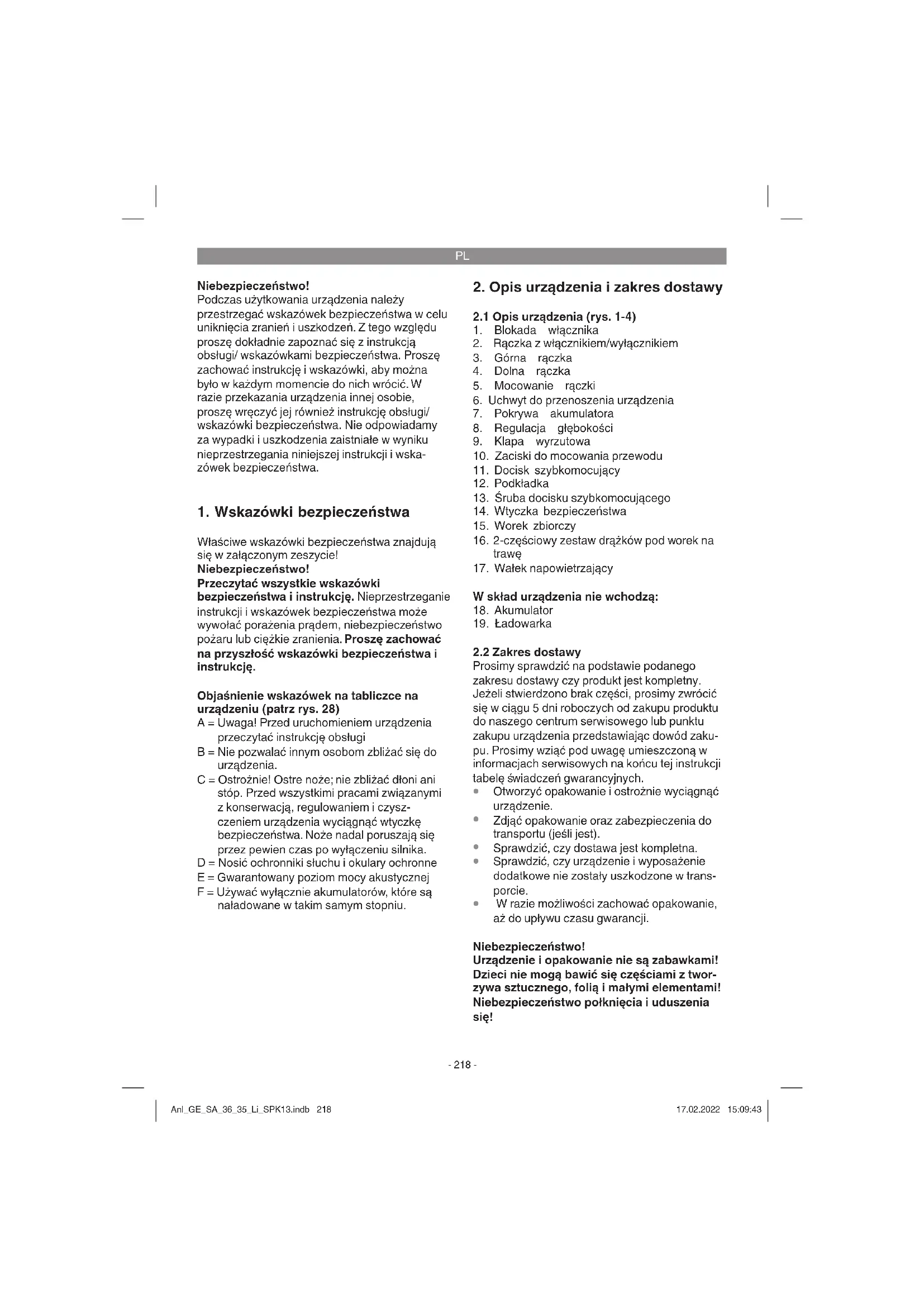 W razie możliwości zachować opakowanie, aż do upływu czasu gwarancji. Niebezpieczeństwo! Urządzenie i opakowanie nie są zabawkami! Dzieci nie mogą bawić się częściami z twor- zywa sztucznego, folią i małymi elementami! Niebezpieczeństwo połknięcia i uduszenia się! Anl_GE_SA_36_35_Li_SPK13.indb 218Anl_GE_SA_36_35_Li_SPK13.indb 218 17.02.2022 15:09:4317.02.2022 15:09:43PL