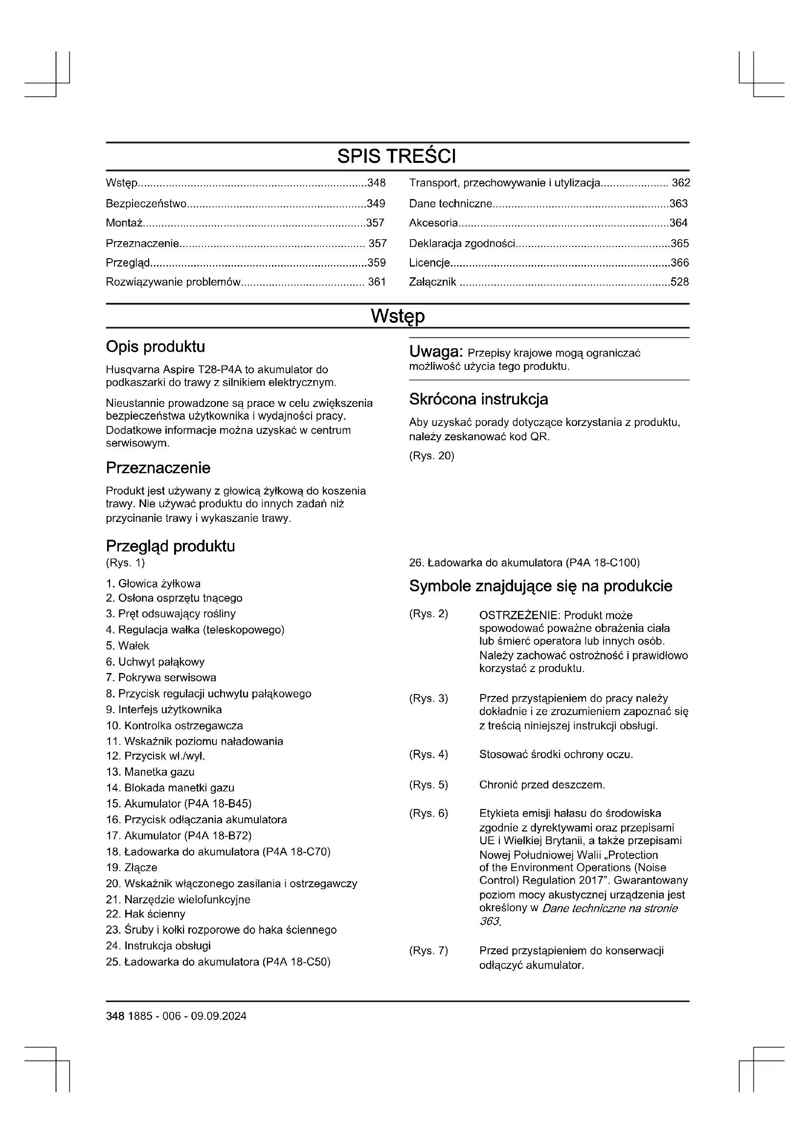 - Załącznik Wstęp Opis produktu Husqvarna Aspire T28-P4A to akumulator do podkaszarki do trawy z silnikiem elektrycznym. Nieustannie prowadzone są prace w celu zwiększenia bezpieczeństwa użytkownika i wydajności pracy. Dodatkowe informacje można uzyskać w centrum serwisowym. Przeznaczenie Produkt jest używany z głowicą żyłkową do koszenia trawy. Nie używać produktu do innych zadań niż przycinanie trawy i wykaszanie trawy. Uwaga: Przepisy krajowe mogą ograniczać możliwość użycia tego produktu. Skrócona instrukcja Aby uzyskać porady dotyczące korzystania z produktu, należy zeskanować kod QR. (Rys. 20) Przegląd produktu (Rys. 1) p. 528