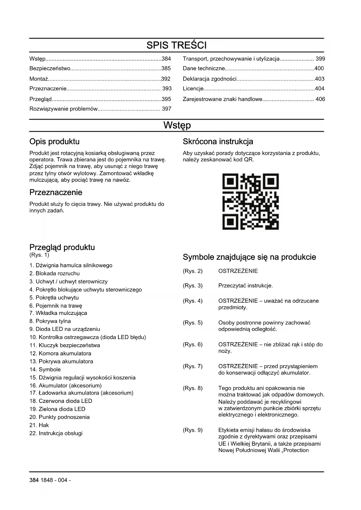 - Zarejestrowane znaki handlowe Wstęp Opis produktu Produkt jest rotacyjną kosiarką obsługiwaną przez operatora. Trawa zbierana jest do pojemnika na trawę. Zdjąć pojemnik na trawę, aby usunąć z niego trawę przez tylny otwór wylotowy. Zamontować wkładkę mulczującą, aby pociąć trawę na nawóz. Przeznaczenie Produkt służy fo cięcia trawy. Nie używać produktu do innych zadań. Skrócona instrukcja Aby uzyskać porady dotyczące korzystania z produktu, należy zeskanować kod QR. Przegląd produktu (Rys. 1) p. 406