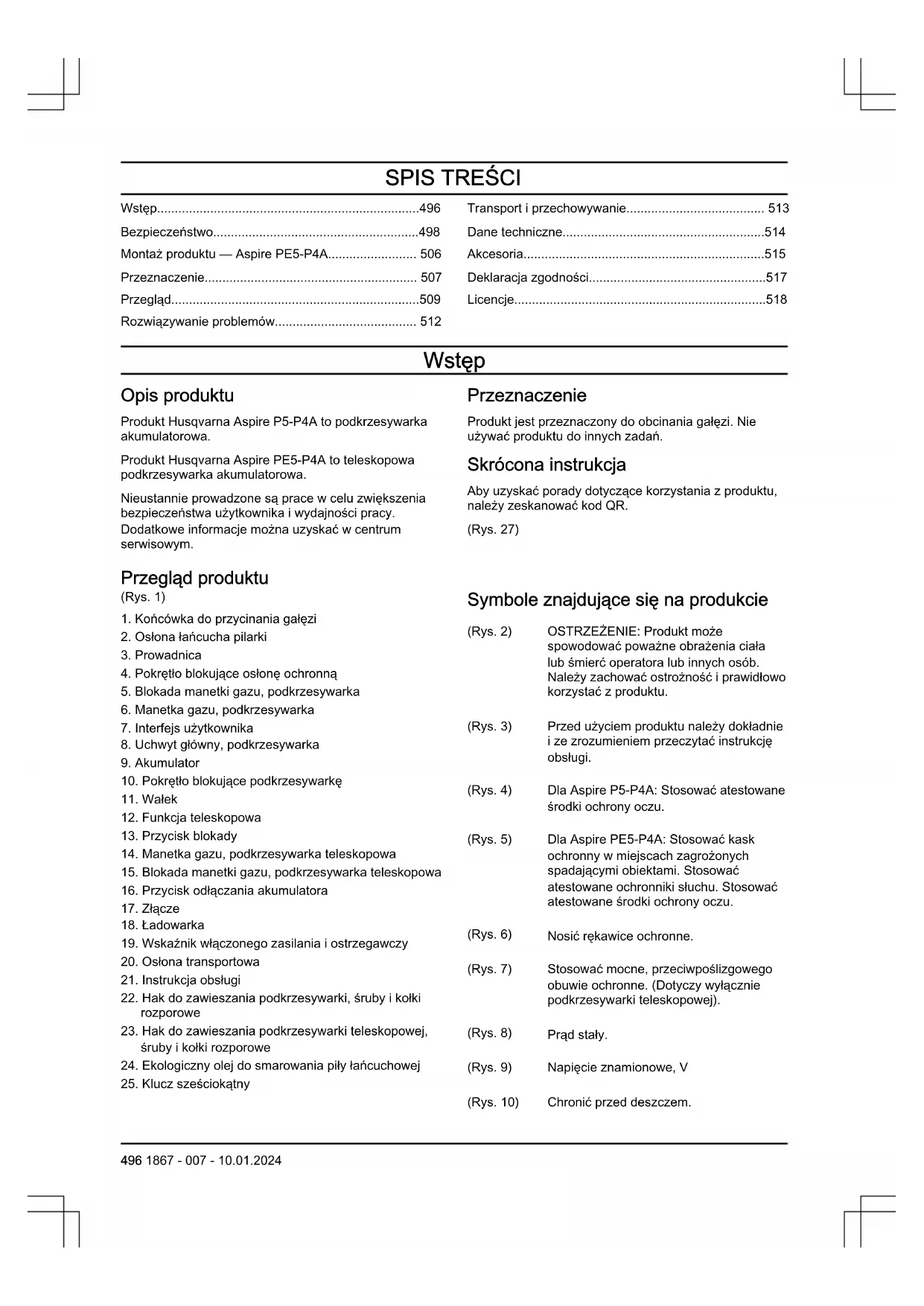- Licencje Wstęp Opis produktu Produkt Husqvarna Aspire P5-P4A to podkrzesywarka akumulatorowa. Produkt Husqvarna Aspire PE5-P4A to teleskopowa podkrzesywarka akumulatorowa. Nieustannie prowadzone są prace w celu zwiększenia bezpieczeństwa użytkownika i wydajności pracy. Dodatkowe informacje można uzyskać w centrum serwisowym. Przeznaczenie Produkt jest przeznaczony do obcinania gałęzi. Nie używać produktu do innych zadań. Skrócona instrukcja Aby uzyskać porady dotyczące korzystania z produktu, należy zeskanować kod QR. (Rys. 27) Przegląd produktu (Rys. 1) p. 518