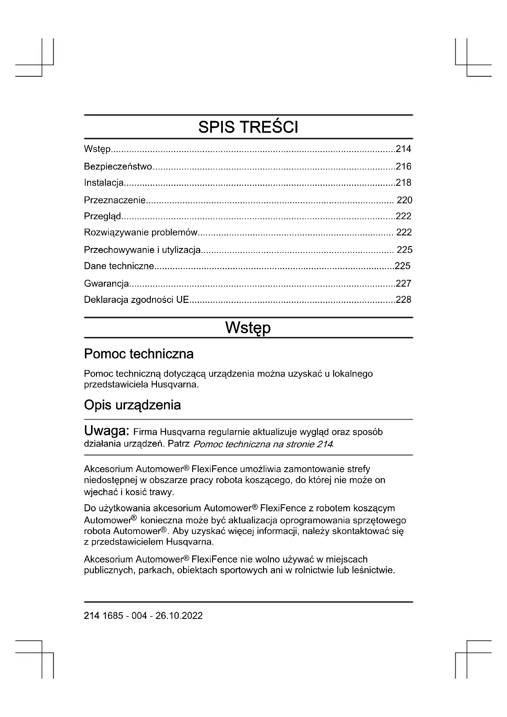 - Deklaracja zgodności UE Wstęp Pomoc techniczna Pomoc techniczną dotyczącą urządzenia można uzyskać u lokalnego przedstawiciela Husqvarna. Opis urządzenia Uwaga: Firma Husqvarna regularnie aktualizuje wygląd oraz sposób działania urządzeń. Patrz Pomoc techniczna na stronie 214 p. 228