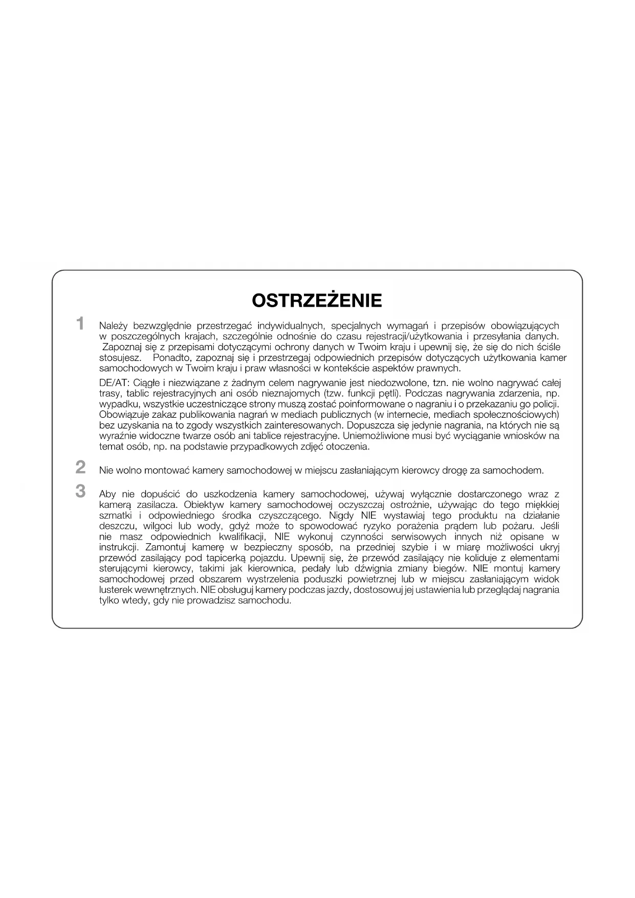 Należy bezwzględnie przestrzegać indywidualnych, specjalnych wymagań i przepisów obowiązujących w poszczególnych krajach, szczególnie odnośnie do czasu rejestracji/użytkowania i przesyłania danych. Zapoznaj się z przepisami dotyczącymi ochrony danych w Twoim kraju i upewnij się, że się do nich ściśle stosujesz. Ponadto, zapoznaj się i przestrzegaj odpowiednich przepisów dotyczących użytkowania kamer samochodowych w Twoim kraju i praw własności w kontekście aspektów prawnych.