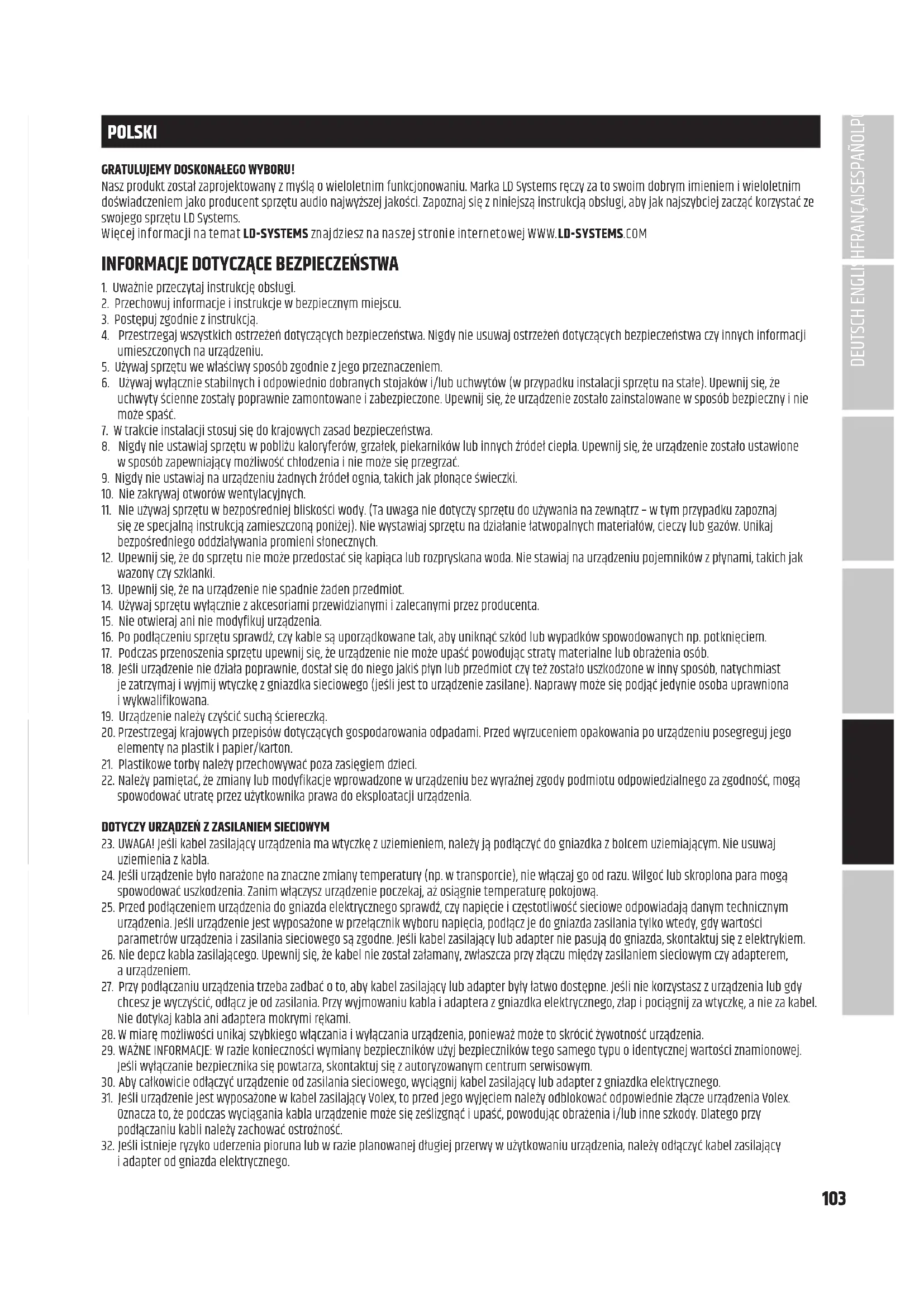 Adam Hall GmbH declara por la presente que este tipo de equipo de radio cumple con la Directiva 2014/53/UE. El texto completo de la declaración de conformidad de la UE está disponible en la siguiente dirección Dirección de Internet disponible: www.adamhall.com/compliance/ ¡Los errores de imprenta y los errores, así como los cambios técnicos o de otro tipo están reservados! DEUTSCHENGLISH FRANÇAIS ESPAÑOL POLSKI ITALIANO103 POLSKI GRATULUJEMY DOSKONAŁEGO WYBORU! Naszproduktzostałzaprojektowanyzmyśląowieloletnimfunkcjonowaniu.MarkaLDSystemsręczyzatoswoimdobrymimieniemiwieloletnim doświadczeniemjakoproducentsprzętuaudionajwyższejjakości.Zapoznajsięzniniejsząinstrukcjąobsługi,abyjaknajszybciejzacząćkorzystaćze swojegosprzętuLDSystems. WięcejinformacjinatematLD-SYSTEMS znajdziesz na naszej stronie internetowej WWW.LD-SYSTEMS.COM