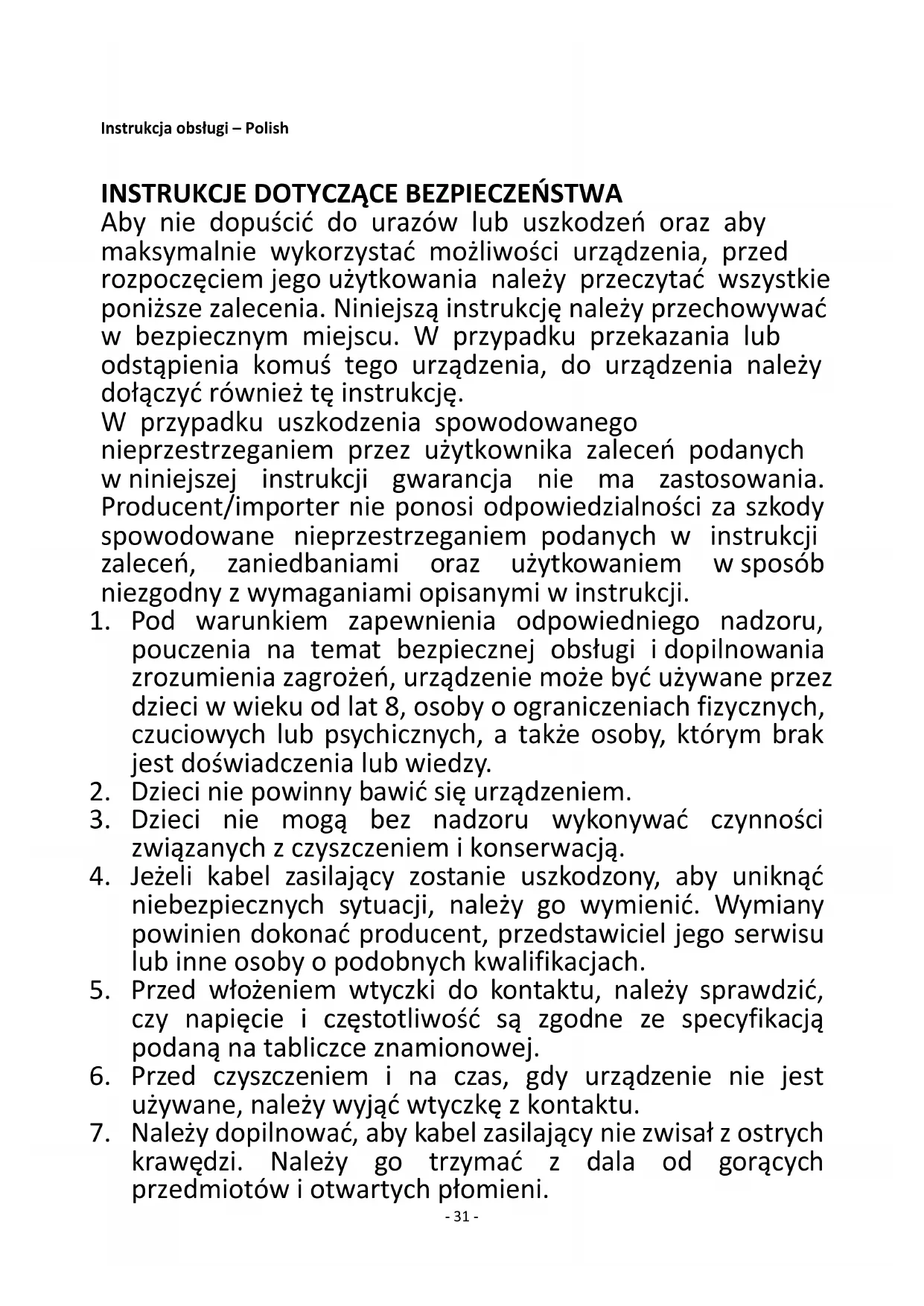 Aby nie dopuścić do urazów lub uszkodzeń oraz aby maksymalnie wykorzystać możliwości urządzenia, przed rozpoczęciem jego użytkowania należy przeczytać wszystkie poniższe zalecenia. Niniejszą instrukcję należy przechowywać w bezpiecznym miejscu. W przypadku przekazania lub odstąpienia komuś tego urządzenia, do urządzenia należy dołączyć również tę instrukcję. W przypadku uszkodzenia spowodowanego nieprzestrzeganiem przez użytkownika zaleceń podanych w niniejszej instrukcji gwarancja nie ma zastosowania. Producent/importer nie ponosi odpowiedzialności za szkody spowodowane nieprzestrzeganiem podanych w instrukcji zaleceń, zaniedbaniami oraz użytkowaniem w sposób niezgodny z wymaganiami opisanymi w instrukcji.