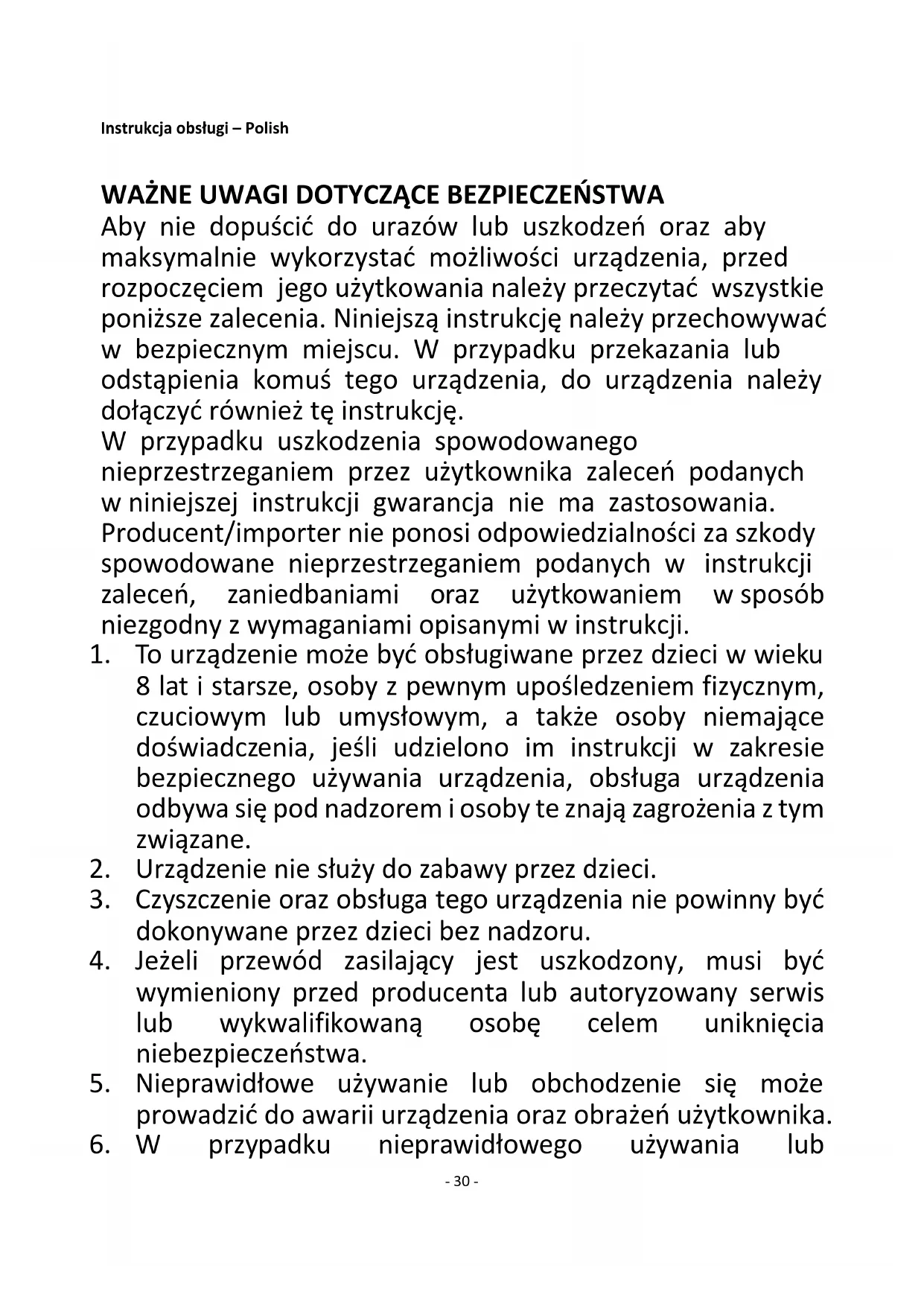 Instrukcja obsługi – Polish WAŻNE UWAGI DOTYCZĄCE BEZPIECZEŃSTWA Aby nie dopuścić do urazów lub uszkodzeń oraz aby maksymalnie wykorzystać możliwości urządzenia, przed rozpoczęciem jego użytkowania należy przeczytać wszystkie poniższe zalecenia. Niniejszą instrukcję należy przechowywać w bezpiecznym miejscu. W przypadku przekazania lub odstąpienia komuś tego urządzenia, do urządzenia należy dołączyć również tę instrukcję. W przypadku uszkodzenia spowodowanego nieprzestrzeganiem przez użytkownika zaleceń podanych w niniejszej instrukcji gwarancja nie ma zastosowania. Producent/importer nie ponosi odpowiedzialności za szkody spowodowane nieprzestrzeganiem podanych w instrukcji zaleceń, zaniedbaniami oraz użytkowaniem w sposób niezgodny z wymaganiami opisanymi w instrukcji.