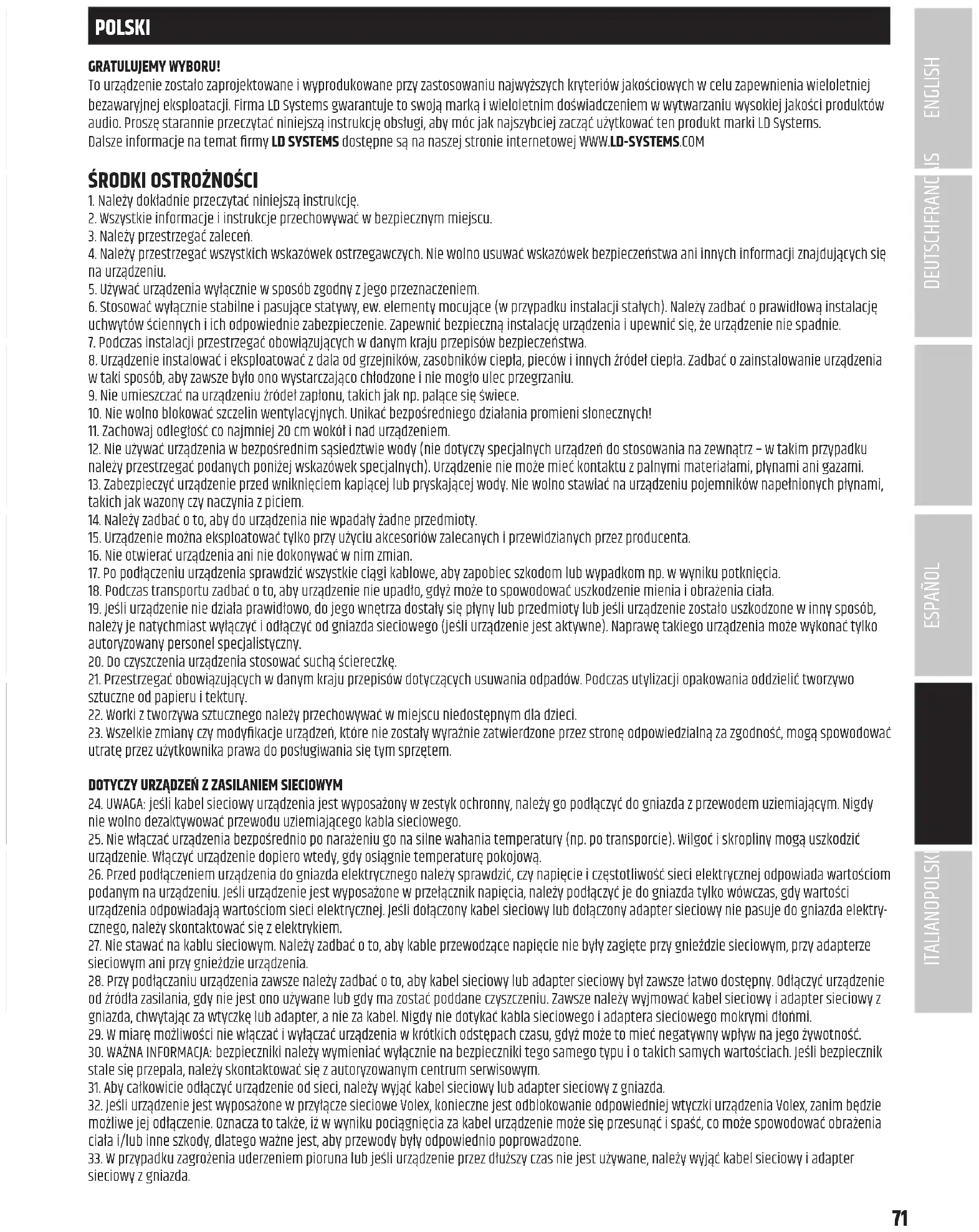ITALIANO POLSKI ESPAÑOL FRANCAIS DEUTSCHENGLISHPOLSKI GRATULUJEMY WYBORU! To urządzenie zostało zaprojektowane i wyprodukowane przy zastosowaniu najwyższych kryteriów jakościowych w celu zapewnienia wieloletniej bezawaryjnej eksploatacji. Firma LD Systems gwarantuje to swoją marką i wieloletnim doświadczeniem w wytwarzaniu wysokiej jakości produktów audio. Proszę starannie przeczytać niniejszą instrukcję obsługi, aby móc jak najszybciej zacząć użytkować ten produkt marki LD Systems. Dalsze informacje na temat rmy LD SYSTEMS dostępne są na naszej stronie internetowej WWW.LD-SYSTEMS.COM