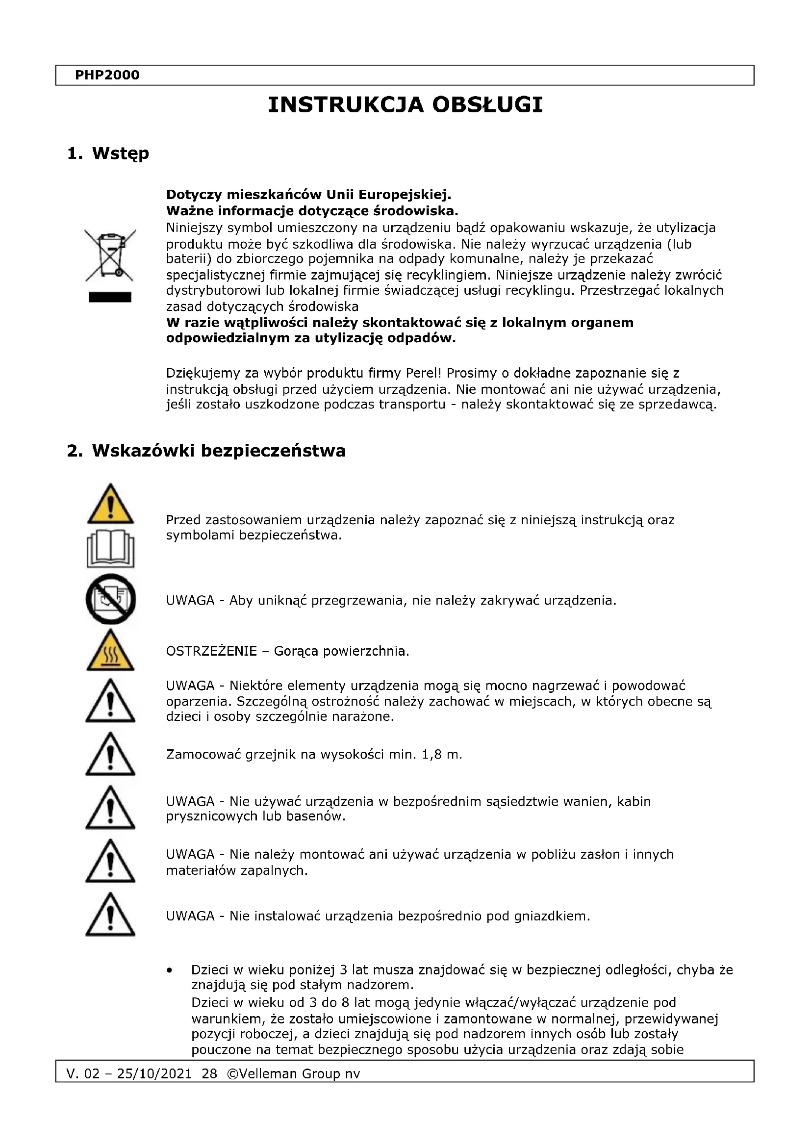 - Dzieci w wieku poniżej 3 lat musza znajdować się w bezpiecznej odległości, chyba że znajdują się pod stałym nadzorem. Dzieci w wieku od 3 do 8 lat mogą jedynie włączać/wyłączać urządzenie pod warunkiem, że zostało umiejscowione i zamontowane w normalnej, przewidywanej pozycji roboczej, a dzieci znajdują się pod nadzorem innych osób lub zostały pouczone na temat bezpiecznego sposobu użycia urządzenia oraz zdają sobiePHP2000