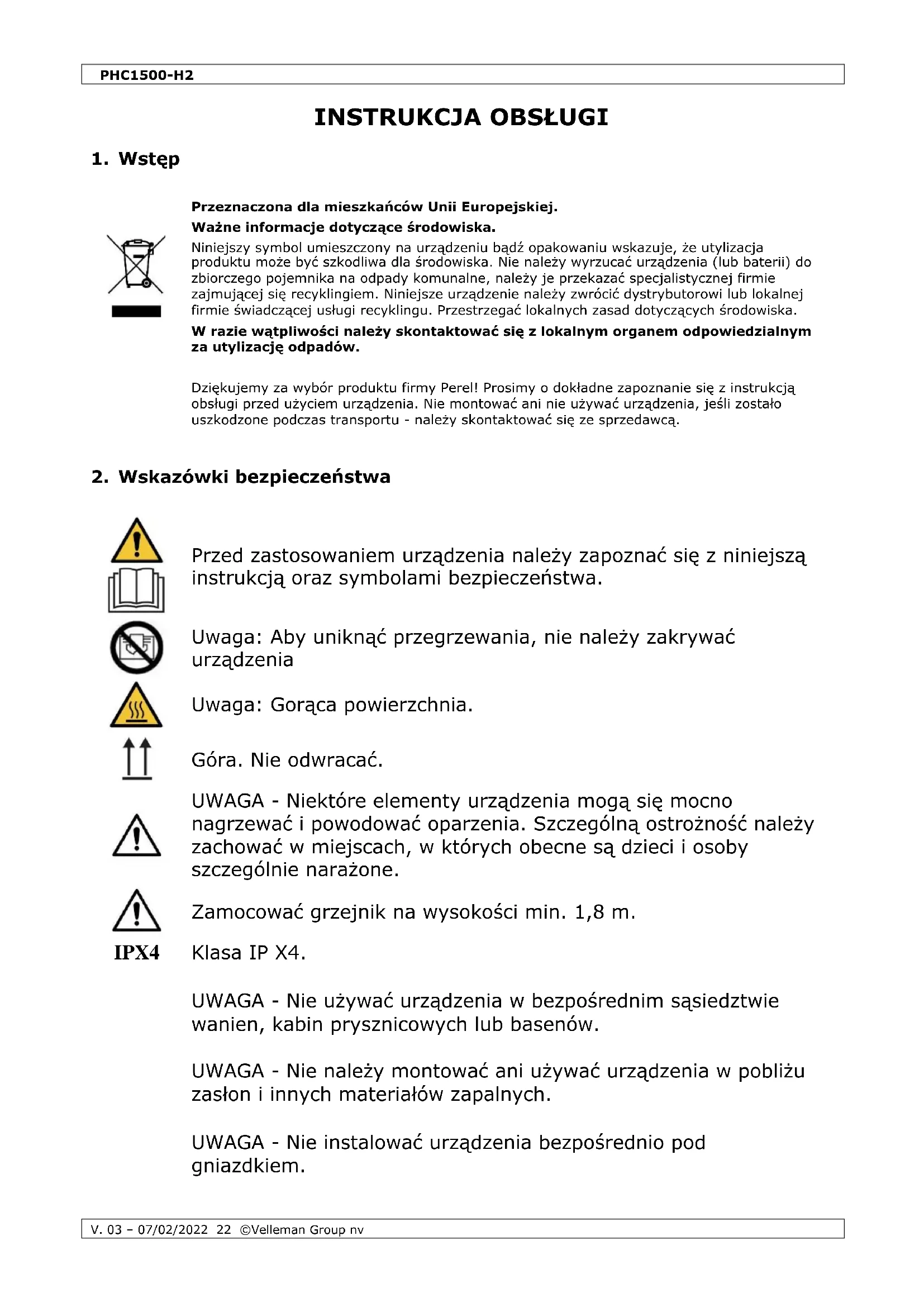 Właścicielem praw autorskich do niniejszej instrukcji jest firma Velleman Group nv. Wszelkie prawa są zastrzeżone na całym świecie. Żadna część niniejszej instrukcji nie może być kopiowana, powielana, tłumaczona ani przenoszona na jakikolwiek nośnik elektroniczny (lub w inny sposób) bez wcześniejszej pisemnej zgody właściciela praw autorskich.PHC1500-H2