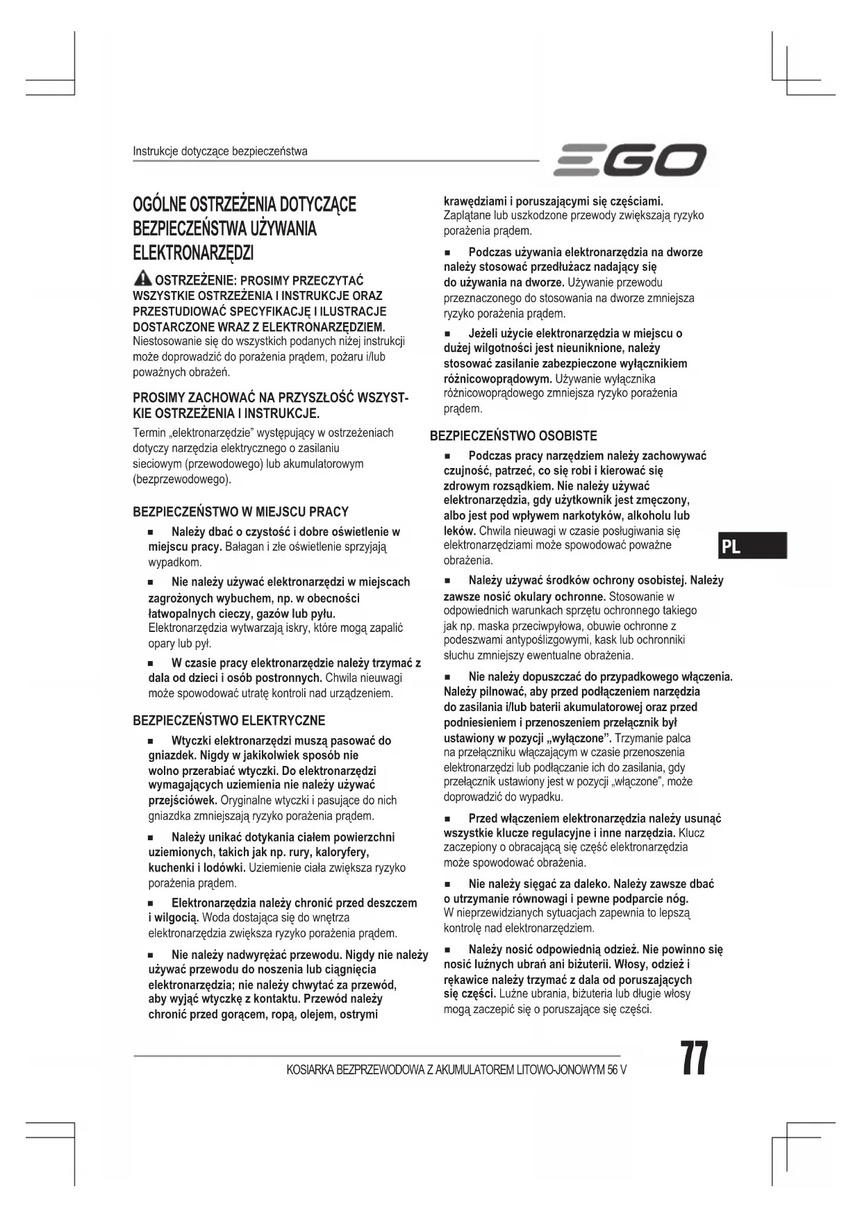 ◾ Aby uniknąć kontaktu z ostrzami lub obrażeniami przez wyrzucone przedmioty, nie wykraczaj poza strefę koszenia i pilnuj, by dzieci, osoby postronne, osoby pomagające oraz zwierzęta znajdowały się w odległości co najmniej 30 metrów od pracującej kosiarki. Zatrzymaj urządzenie, gdy ktoś wejdzie do strefy roboczej. ◾ Zawsze noś okulary ochronne lub osłonę na oczy podczas obsługi i czynności regulacyjnych lub naprawczych, by chronić oczy. Wyrzucone przedmioty mogą spowodować poważne obrażenia oczu. Podczas pracy powodującej pylenie używaj maseczki przeciwpyłowej na twarz. ◾ Noś odpowiednie ubranie - Nie noś luźnych ubrań i biżuterii. Mogą być one wciągnięte przez ruchome części. Zaleca się noszenie gumowych rękawic i obuwia podczas pracy na zewnątrz. Noś stabilne obuwie o szorstkiej podeszwie oraz wąskie spodnie i bluzki. Zaleca się noszenie bluzek i spodni okrywających ramiona i nogi oraz obuwia z metalowym podnoskiem. Nigdy nie obsługuj urządzenia na boso, w sandałach, śliskim lub lekkim.(np. płóciennym) obuwiu. ◾ Nie zbliżaj rąk i nóg do ruchomych części i nie wkładaj ich pod spód pokrywy. Zbliżenie rąk i stóp do ostrza może spowodować ich zranienie. ◾ Brakująca lub uszkodzona pokrywa może spowodować dotknięcie ostrzy i obrażenia spowodowane wyrzuconymi przedmiotami. ◾ Wiele obrażeń jest spowodowanych przeciągnięciem kosiarki nad stopą podczas upadku na skutek poślizgnięcia się lub potknięcia. Nie trzymaj się kosiarki podczas upadku, natychmiast ją puść. ◾ Nie pociągaj nigdy kosiarki do siebie jak idziesz. Jeśli musisz pociągnąć kosiarkę do tyłu od ściany lub od przeszkody, najpierw spójrz w dół i do tyłu, by uniknąć potknięcia się i postępuj zgodnie z następującymi etapami: ◾ Odsuń się od kosiarki, by wyciągnąć ramię na całą długość. ◾ Upewnij się, że zachowujesz równowagę i masz dobre oparcie na nogi. ◾ Pociągnij powoli kosiarkę do połowy odległości od siebie. ◾ Powtórz czynności w razie potrzeby. ◾ Nie używaj urządzenia pod wpływem alkoholu lub narkotyków. ◾ Nigdy nie używaj urządzenia z uszkodzonymi osłonami, bez zamontowanego pojemnika na trawę, bez zamontowanej osłony przeciwkamiennej lub innych elementów ochronnych. ◾ Zachowaj czujność - patrz na to, co robisz. Kieruj się zdrowym rozsądkiem. Nie używaj kosiarki do trawy, kiedy jesteś zmę czony. ◾ Uchwyt sterujący silnika/ostrza jest mechanizmem zabezpieczającym. Nigdy nie próbuj obchodzić jego działania. Mechanizm ten będzie mógł wtedy działać, co może spowodować obrażenia na skutek dotknięcia ruchomego ostrza. Uchwyt sterujący silnika/ostrza musi swobodnie działać w dwóch kierunkach i automatycznie powracać do wyłączonej pozycji, gdy jest zwolniony. ◾ Unikaj niebezpiecznych środowisk - Nie zostawiaj kosiarki w miejscach wilgotnych lub mokrych. ◾ Nie używaj podczas deszczu. ◾ Upewnij się zawsze, że masz punkt oparcia. Poślizgnięcie się i upadek mogą spowodować poważne obrażenia. Jeśli czujesz, że tracisz oparcie, zwolnij natychmiast uchwyt sterujący silnika/ostrza a ostrze przestanie się obracać w ciągu trzech sekund. ◾ Zatrzymaj ostrze, gdy przechodzi przez żwirowe podłoże, chodniki lub drogi. ◾ Jeśli sprzęt zacznie nietypowo wibrować, wyłącz silnik i poszukaj natychmiast przyczyny. Wibracje stanowią zazwyczaj objaw usterek. ◾ Sprawdź, czy nie jest uszkodzone; ◾ Wymień lub napraw uszkodzone części, które mogą być wymienione przez użytkownika; ◾ Sprawdź, czy nie ma poluzowanych części. ◾ Nigdy nie używaj kosiarki bez właściwej osłony tylnej, pokrywy wyładowania, worka na trawę, przysłony do mulczowania, bocznego wylotu, uchwytu sterującego silnika/ostrza lub innych elementów zabezpieczających..Nigdy nie używaj kosiarki z uszkodzonymi elementami zabezpieczającymi. Nieprzestrzeganie tego zalecenia może spowodować poważne obrażenia. ◾ Jeśli wystąpi jakaś sytuacja nieopisana w niniejszej instrukcji, zachowaj ostrożność i użyj odpowiedniego osądzania. Skontaktuj się z punktem obsługi klienta EGO. ◾ Akumulator musi być wyjęty z urządzenia przed wyrzuceniem. ◾ Należy bezpiecznie wyrzucać akumulator. OBSŁUGA NA ZBOCZACH:Zbocza są głównym czynnikiem poślizgnięć i upadków, które mogą powodować poważne obrażenia. Upewnij się zawsze, że masz punkt oparcia na zboczach. Obsługa na zboczach wymaga dodatkowej ostrożności. Jeśli nie czujesz się pewnie na zboczach, nie koś tam trawy. Wykonaj następujące czynności: ◾ Koś naprzeciw zbocza, nigdy z góry na dół ani z dołu do góry. Zachowaj szczególną ostrożność przy zmianie kierunku na zboczu. ◾ Uważaj na dziury, skały, ukryte przedmioty lub wyboje, które mogą spowodować poślizgnięcie lub potknięcie. Wysoka trawa maskuje przeszkody.KOSIARKA BEZPRZEWODOWA Z AKUMULATOREM LITOWO-JONOWYM 56 V