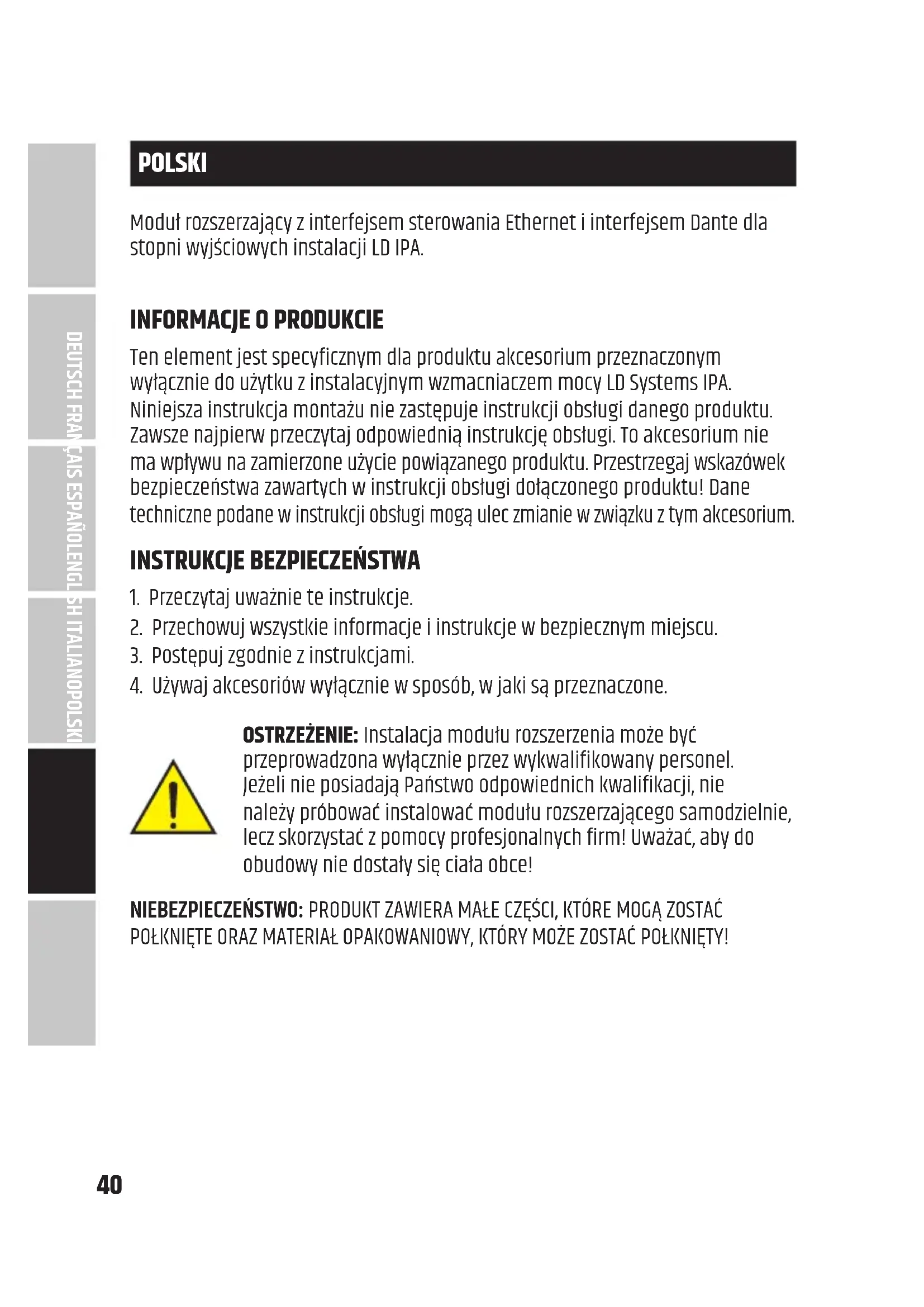 ENGLISH40 POLSKI Moduł rozszerzający z interfejsem sterowania Ethernet i interfejsem Dante dla stopni wyjściowych instalacji LD IPA.