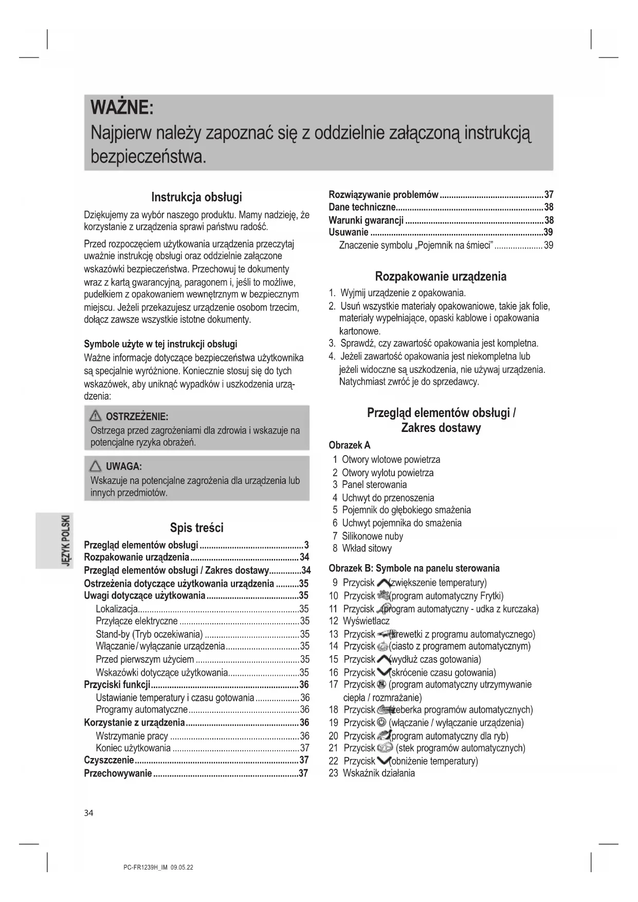 Przycisk (program automatyczny - udka z kurczaka) 12 Wyświetlacz 13 Przycisk (krewetki z programu automatycznego) 14 Przycisk (ciasto z programem automatycznym) 15 Przycisk (wydłuż czas gotowania) 16 Przycisk (skrócenie czasu gotowania) 17 Przycisk (program automatyczny utrzymywanie ciepła / rozmrażanie) 18 Przycisk (żeberka programów automatycznych) 19 Przycisk (włączanie / wyłączanie urządzenia) 20 Przycisk (program automatyczny dla ryb) 21 Przycisk (stek programów automatycznych) 22 Przycisk (obniżenie temperatury) 23 Wskaźnik działaniaPC-FR1239H_IM 09.05.22