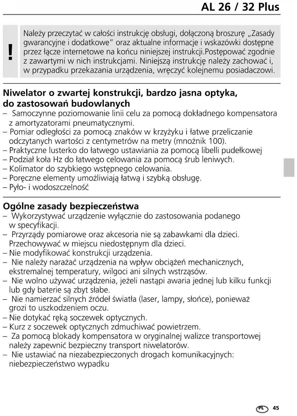 Ogólne zasady bezpieczeństwa – Wykorzystywać urządzenie wyłącznie do zastosowania podanego wspecykacji. – Przyrządy pomiarowe oraz akcesoria nie są zabawkami dla dzieci. Przechowywać wmiejscu niedostępnym dla dzieci. – Nie modykować konstrukcji urządzenia. – Nie należy narażać urządzenia na wpływ obciążeń mechanicznych, ekstremalnej temperatury, wilgoci ani silnych wstrząsów. – Nie wolno używać urządzenia, jeżeli nastąpi awaria jednej lub kilku funkcji lub gdy baterie są zbyt słabe. – Nie namierzać silnych źródeł światła (laser, lampy, słońce), ponieważ grozi to uszkodzeniem oczu. – Nie dotykać ręką soczewek optycznych. – Kurz z soczewek optycznych zdmuchiwać powietrzem. – Za pomocą blokady kompensatora w oryginalnej walizce transportowej należy zapewnić bezpieczny transport niwelatorów. – Nie ustawiać na niezabezpieczonych drogach komunikacyjnych: niebezpieczeństwo wypadku Należy przeczytać wcałości instrukcję obsługi, dołączoną broszurę „Zasady gwarancyjne idodatkowe” oraz aktualne informacje iwskazówki dostępne przez łącze internetowe na końcu niniejszej instrukcji.Postępować zgodnie z zawartymi w nich instrukcjami. Niniejszą instrukcję należy zachować i, w przypadku przekazania urządzenia, wręczyć kolejnemu posiadaczowi.