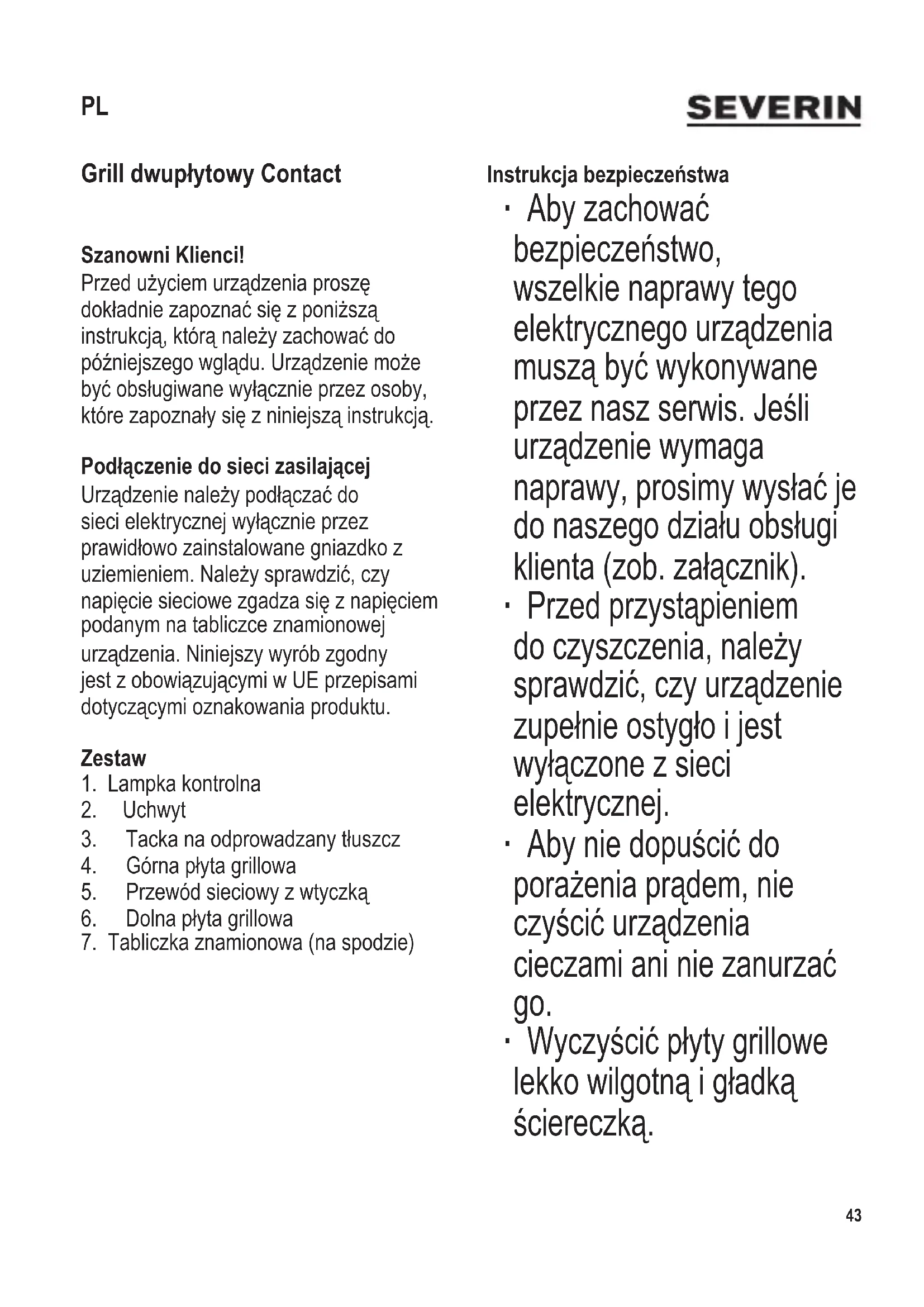 Grill dwupłytowy Contact Szanowni Klienci! Przedużyciemurządzeniaproszę dokładniezapoznaćsięzponiższą instrukcją,którąnależyzachowaćdo późniejszegowglądu.Urządzeniemoże byćobsługiwanewyłącznieprzezosoby, którezapoznałysięzniniejsząinstrukcją. Podłączenie do sieci zasilającej Urządzenienależypodłączaćdo siecielektrycznejwyłącznieprzez prawidłowozainstalowanegniazdkoz uziemieniem.Należysprawdzić,czy napięciesieciowezgadzasięznapięciem podanym na tabliczce znamionowej urządzenia.Niniejszywyróbzgodny jestzobowiązującymiwUEprzepisami dotyczącymioznakowaniaproduktu. Zestaw