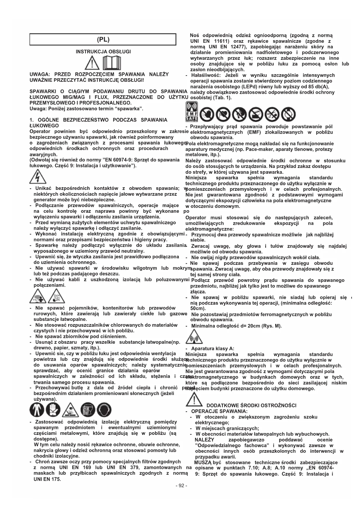 ŁUKOWEGO Operator powinien być odpowiednio przeszkolony w zakresie bezpiecznegoużywaniuspawarki,jakrównieżpoinformowany o zagrożeniach związanych z procesami spawania łukowego, odpowiednich środkach ochronnych oraz procedurach awaryjnych. (Odwołajsięrównieżdonormy”EN60974-9:Sprzętdospawania łukowego.Część9:Instalacjaiużytkowanie”). - Unikać bezpośrednich kontaktów z obwodem spawania; w niektórychokolicznościachnapięciejałowewytwarzaneprzez generatormożebyćniebezpieczne. - Podłączanie przewodów spawalniczych, operacje mające na celu kontrolę oraz naprawa powinny być wykonane po wyłączeniuspawarkiiodłączeniuzasilaniaurządzenia. - Przedwymianązużytychelementówuchwytuspawalniczego należywyłączyćspawarkęiodłączyćzasilanie. - Wykonać instalację elektryczną zgodnie z obowiązującymi normamiorazprzepisamibezpieczeństwaihigienypracy. - Spawarkę należy podłączyć wyłącznie do układu zasilania wyposażonegowuziemionyprzewódneutralny. - Upewnićsię,żewtyczkazasilaniajestprawidłowopodłączona douziemieniaochronnego. - Nie używać spawarki w środowisku wilgotnym lub mokrym lubteżpodczaspadającegodeszczu. - Nie używać kabli z uszkodzoną izolacją lub poluzowanymi połączeniami. - Nie spawać pojemników, kontenitorów lub przewodów rurowych, które zawierają lub zawierały ciekłe lub gazowe substancjełatwopalne. - Niestosowaćrozpuszczalnikówchlorowanychdomateriałów czystychinieprzechowywaćwichpobliżu. - Niespawaćzbiornikówpodciśnieniem. - Usunąćzobszaru pracywszelkie substancjełatwopalne(np. drewno,papier,szmaty,itp.). - Upewnićsie,czywpobliżułukujestodpowiedniawentylacja powietrza lub czy znajdują się odpowiednie środki służące do usuwania oparów spawalniczych; należy systematycznie sprawdzać, aby ocenić granice działania oparów spawalniczych w zależności od ich składu, stężenia i czasu trwania samego procesu spawania. - Przechowywaćbutlę z dala od źródeł ciepła i chronić przed bezpośrednimdziałaniempromieniowanisłonecznych(jeżeli używana). - Zastosować odpowiednią izolację elektryczną pomiędzy spawanym przedmiotem i ewentualnymi uziemionymi częściami metalowymi, które znajdują się w pobliżu (są dostępne). Wtymcelunależynosićrękawiceochronne,obuwieochronne, nakryciagłowyiodzieżochronnąorazstosowaćpomostylub chodnikiizolacyjne. - Chrońzawszeoczyprzypomocyspecjalnychltrówzgodnych z normą UNI EN 169 lub UNI EN 379, zamontowanych na maskach lub przyłbicach spawalniczych zgodnych z normą UNI EN 175. Noś odpowiednią odzież ognioodporną (zgodną z normą UNI EN 11611) oraz rękawice spawalnicze (zgodne z normą UNI EN 12477), zapobiegając narażeniu skóry na działanie promieniowania nadoletowego i podczerwonego wytwarzanych przez łuk; rozszerz zabezpieczenie na inne osoby znajdujące się w pobliżu łuku za pomocą osłon lub zasłonnieodbijających. - Hałaśliwość: Jeżeli w wyniku szczególnie intensywnych operacjispawaniazostaniestwierdzonypoziomcodziennego narażeniaosobistego(LEPd)równylubwyższyod85db(A), należyobowiązkowozastosowaćodpowiednieśrodkiochrony osobistej (Tab. 1). - Przepływający prąd spawania powoduje powstawanie pól elektromagnetycznych (EMF) zlokalizowanych w pobliżu obwodu spawania. Polaelektromagnetycznemogąnakładaćsięnafunkcjonowanie aparaturymedycznej(np.Pace-maker,aparatytlenowe,protezy metalowe, itp.). Należy zastosować odpowiednie środki ochronne w stosunku doosóbstosującychteurządzenia.Naprzykładzakazdostępu dostrefy,wktórejużywanajestspawarka. Niniejsza spawarka spełnia wymagania standardu technicznegoproduktuprzeznaczonegodoużytkuwyłączniew pomieszczeniach przemysłowych i w celach profesjonalnych. Niejest gwarantowana zgodność z podstawowymi wymogami dotyczącymiekspozycjiczłowiekanapolaelektromagnetyczne wotoczeniudomowym. Operator musi stosować się do następujących zaleceń, umożliwiających zredukowanie ekspozycji na pola elektromagnetyczne: - Przymocujdwaprzewodyspawalniczemożliwie jaknajbliżej siebie. - Zwracaj uwagę, aby głowa i tułów znajdowały się najdalej możliwieodobwoduspawania. - Nieowijajnigdyprzewodówspawalniczychwokółciała. - Nie spawaj podczas przebywania w zasięgu obwodu spawania.Zwracajuwagę,abyobaprzewodyznajdowałysięz tejsamejstronyciała. - Podłącz przewód powrotny prądu spawania do spawanego przedmiotu,najbliżejjaktylkojesttomożliwedospawanego złącza. - Nie spawaj w pobliżu spawarki, nie siadaj lub opieraj się o niąpodczaswykonywaniatejoperacji,(minimalnaodległość: 50cm). - Niepozostawiajprzedmiotówferromagnetycznychwpobliżu obwodu spawania. - Minimalnaodległośćd=20cm(Rys.M). - AparaturaklasyA: Niniejsza spawarka spełnia wymagania standardu technicznegoproduktuprzeznaczonegodoużytkuwyłączniew pomieszczeniach przemysłowych i w celach profesjonalnych. Niejestgwarantowanazgodnośćzwymogamidotyczącymipola elektromagnetycznego w budynkach domowych oraz w tych, które są podłączone bezpośrednio do sieci zasilającej niskim napięciembudynkiprzeznaczonedoużytkudomowego.