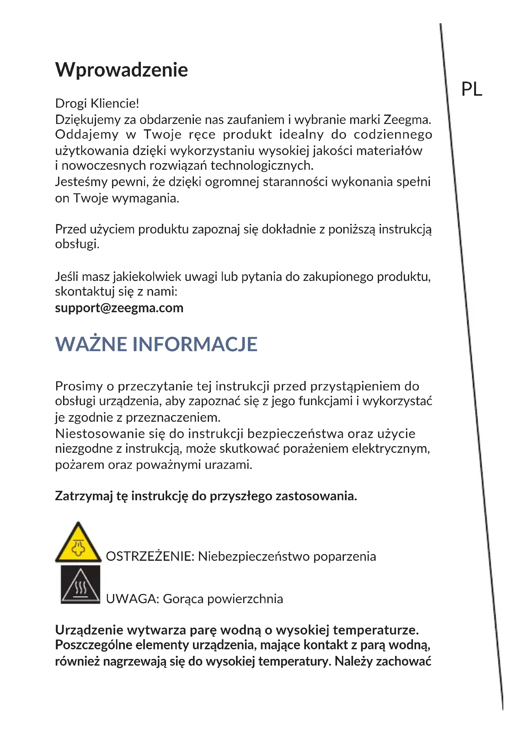 Prosimy o przeczytanie tej instrukcji przed przystąpieniem do obsługi urządzenia, aby zapoznać się z jego funkcjami i wykorzystać je zgodnie z przeznaczeniem. Niestosowanie się do instrukcji bezpieczeństwa oraz użycie niezgodne z instrukcją, może skutkować porażeniem elektrycznym, pożarem oraz poważnymi urazami. Zatrzymaj tę instrukcję do przyszłego zastosowania. OSTRZEŻENIE: Niebezpieczeństwo poparzenia UWAGA: Gorąca powierzchnia Urządzenie wytwarza parę wodną o wysokiej temperaturze. Poszczególne elementy urządzenia, mające kontakt z parą wodną, również nagrzewają się do wysokiej temperatury. Należy zachowaćPL szczególną ostrożność przy korzystaniu z urządzenia, aby uniknąć poparzenia.