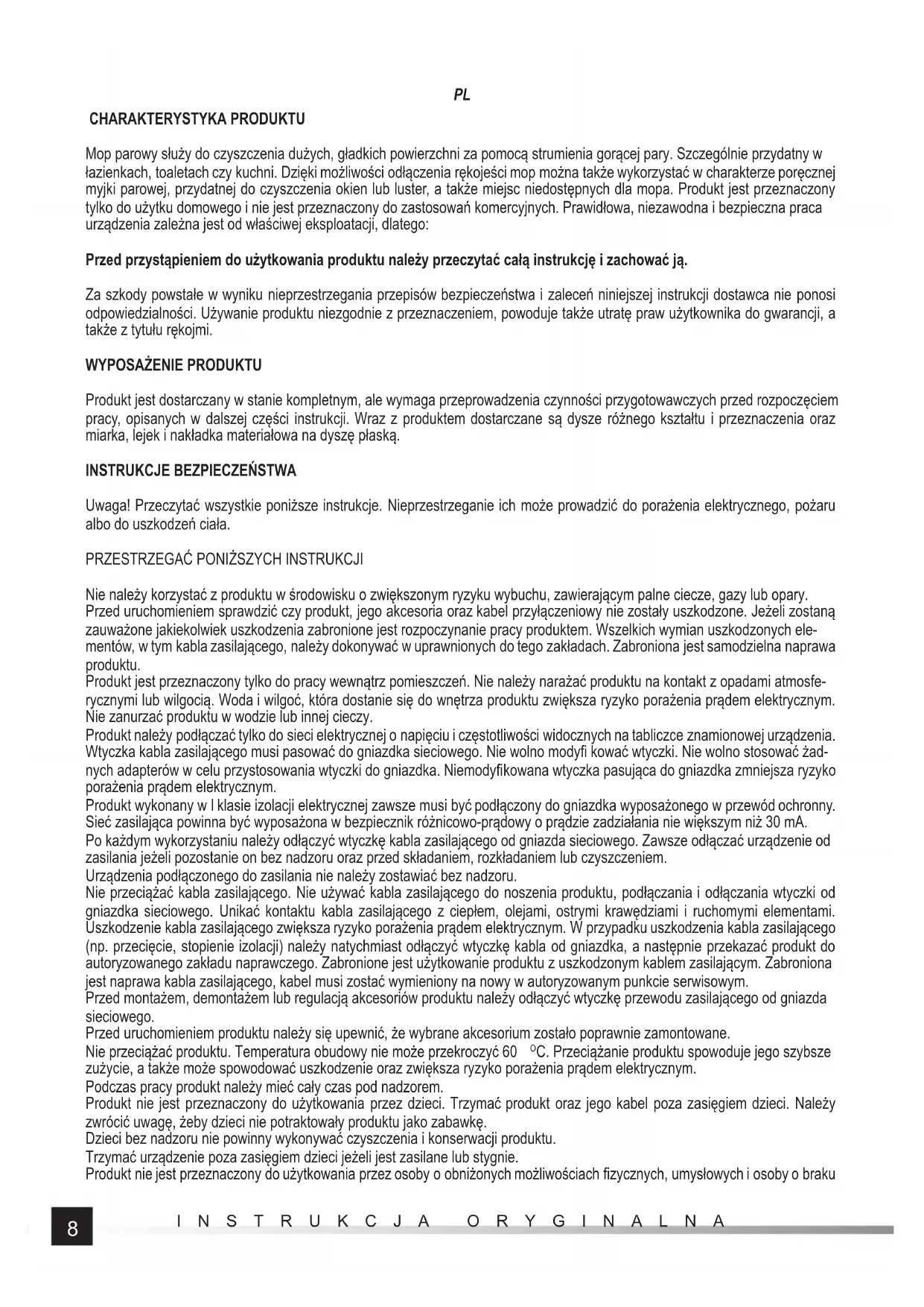 CHARAKTERYSTYKA PRODUKTU Mop parowy służy do czyszczenia dużych, gładkich powierzchni za pomocą strumienia gorącej pary. Szczególnie przydatny w łazienkach, toaletach czy kuchni. Dzięki możliwości odłączenia rękojeści mop można także wykorzystać w charakterze poręcznej myjki parowej, przydatnej do czyszczenia okien lub luster, a także miejsc niedostępnych dla mopa. Produkt jest przeznaczony tylko do użytku domowego i nie jest przeznaczony do zastosowań komercyjnych. Prawidłowa, niezawodna i bezpieczna praca urządzenia zależna jest od właściwej eksploatacji, dlatego: Przed przystąpieniem do użytkowania produktu należy przeczytać całą instrukcję i zachować ją. Za szkody powstałe w wyniku nieprzestrzegania przepisów bezpieczeństwa i zaleceń niniejszej instrukcji dostawca nie ponosi odpowiedzialności. Używanie produktu niezgodnie z przeznaczeniem, powoduje także utratę praw użytkownika do gwarancji, a także z tytułu rękojmi.
