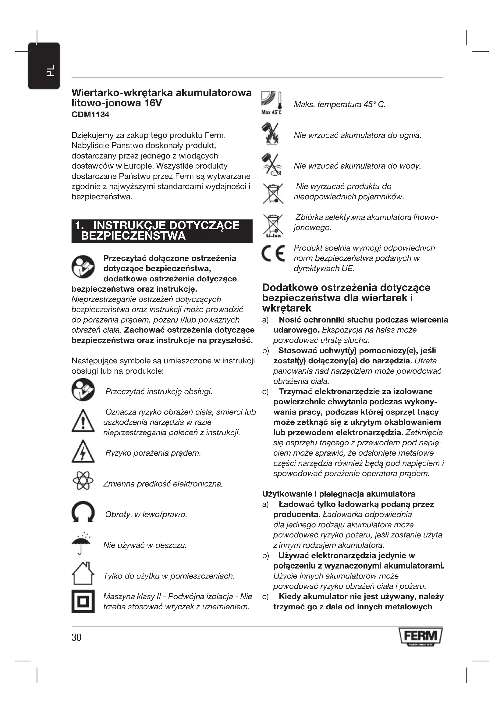 Wiertarko-wkrętarka akumulatorowa litowo-jonowa 16V CDM1134 Dziękujemy za zakup tego produktu Ferm. Nabyliście Państwo doskonały produkt, dostarczany przez jednego z wiodących dostawców w Europie. Wszystkie produkty dostarczane Państwu przez Ferm są wytwarzane zgodnie z najwyższymi standardami wydajności i bezpieczeństwa.