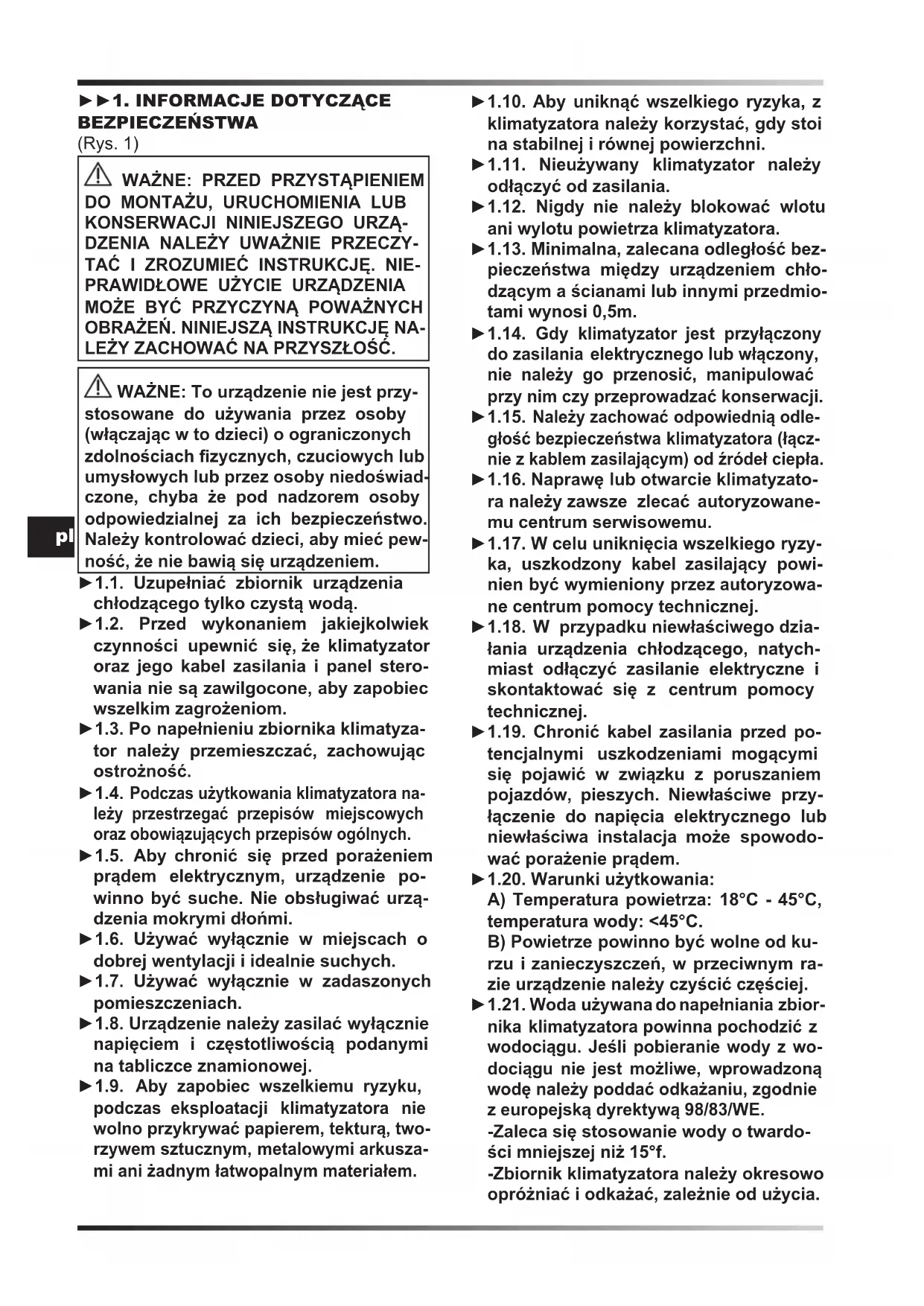 LEŻY ZACHOWAĆ NA PRZYSZŁOŚĆ. WAŻNE: To urządzenie nie jest przy- stosowane do używania przez osoby (włączając w to dzieci) o ograniczonych zdolnościach zycznych, czuciowych lub umysłowych lub przez osoby niedoświad- czone, chyba że pod nadzorem osoby odpowiedzialnej za ich bezpieczeństwo. Należy kontrolować dzieci, aby mieć pew- ność, że nie bawią się urządzeniem. ►1.1. Uzupełniać zbiornik urządzenia chłodzącego tylko czystą wodą. ►1.2. Przed wykonaniem jakiejkolwiek czynności upewnić się, że klimatyzator oraz jego kabel zasilania i panel stero- wania nie są zawilgocone, aby zapobiec wszelkim zagrożeniom. ►1.3. Po napełnieniu zbiornika klimatyza- tor należy przemieszczać, zachowując ostrożność. ►1.4. Podczas użytkowania klimatyzatora na- leży przestrzegać przepisów miejscowych oraz obowiązujących przepisów ogólnych. ►1.5. Aby chronić się przed porażeniem prądem elektrycznym, urządzenie po- winno być suche. Nie obsługiwać urzą- dzenia mokrymi dłońmi. ►1.6. Używać wyłącznie w miejscach o dobrej wentylacji i idealnie suchych. ►1.7. Używać wyłącznie w zadaszonych pomieszczeniach. ►1.8. Urządzenie należy zasilać wyłącznie napięciem i częstotliwością podanymi na tabliczce znamionowej. ►1.9. Aby zapobiec wszelkiemu ryzyku, podczas eksploatacji klimatyzatora nie wolno przykrywać papierem, tekturą, two- rzywem sztucznym, metalowymi arkusza- mi ani żadnym łatwopalnym materiałem. ►1.10. Aby uniknąć wszelkiego ryzyka, z klimatyzatora należy korzystać, gdy stoi na stabilnej i równej powierzchni. ►1.11. Nieużywany klimatyzator należy odłączyć od zasilania. ►1.12. Nigdy nie należy blokować wlotu ani wylotu powietrza klimatyzatora. ►1.13. Minimalna, zalecana odległość bez- pieczeństwa między urządzeniem chło- dzącym a ścianami lub innymi przedmio- tami wynosi 0,5m. ►1.14. Gdy klimatyzator jest przyłączony do zasilania elektrycznego lub włączony, nie należy go przenosić, manipulować przy nim czy przeprowadzać konserwacji. ►1.15. Należy zachować odpowiednią odle- głość bezpieczeństwa klimatyzatora (łącz- nie z kablem zasilającym) od źródeł ciepła. ►1.16. Naprawę lub otwarcie klimatyzato- ra należy zawsze zlecać autoryzowane- mu centrum serwisowemu. ►1.17. W celu uniknięcia wszelkiego ryzy- ka, uszkodzony kabel zasilający powi- nien być wymieniony przez autoryzowa- ne centrum pomocy technicznej. ►1.18. W przypadku niewłaściwego dzia- łania urządzenia chłodzącego, natych- miast odłączyć zasilanie elektryczne i skontaktować się z centrum pomocy technicznej. ►1.19. Chronić kabel zasilania przed po- tencjalnymi uszkodzeniami mogącymi się pojawić w związku z poruszaniem pojazdów, pieszych. Niewłaściwe przy- łączenie do napięcia elektrycznego lub niewłaściwa instalacja może spowodo- wać porażenie prądem. ►1.20. Warunki użytkowania: A) Temperatura powietrza: 18°C - 45°C, temperatura wody: <45°C. B) Powietrze powinno być wolne od ku- rzu i zanieczyszczeń, w przeciwnym ra- zie urządzenie należy czyścić częściej. ►1.21. Woda używana do napełniania zbior- nika klimatyzatora powinna pochodzić z wodociągu. Jeśli pobieranie wody z wo- dociągu nie jest możliwe, wprowadzoną wodę należy poddać odkażaniu, zgodnie z europejską dyrektywą 98/83/WE. -Zaleca się stosowanie wody o twardo- ści mniejszej niż 15°f. -Zbiornik klimatyzatora należy okresowo opróżniać i odkażać, zależnie od użycia.pl -Powierzchnie wkładek należy okresowo sprawdzać i odkażać, zależnie od użycia. -Do odkażania należy stosować produk- ty biobójcze zgodne z rozporządzeniem europejskim nr 582/2012. ►►2. ROZPAKOWYWANIE ►2.1. Należy usunąć wszystkie materiały użyte do pakowania i wysyłki klimatyzatora i zlikwidować je zgodnie z obowiązującymi przepisami. ►2.2. Wyjąć wszystkie elementy z opakowania. ►2.3. Sprawdzić, czy występują ewentualne uszkodzenia powstałe podczas transportu. Gdy klimatyzator wydaje się uszkodzony, należy niezwłocznie poinformować sprze- dawcę, u którego został zakupiony. ►►3. MONTAŻ Klimatyzator jest wyposażony w zestaw do kanałowego przepływu powietrza i kółka uła- twiające przemieszczanie. Zależnie od mode- lu, wszystkie elementy mogą już być zainsta- lowane lub są do zainstalowania. Elementy ze śrubami i nakrętkami niezbędnymi do monta- żu znajdują się w opakowaniu (Rys. 2). ►►4. DZIAŁANIE OSTRZEŻENIE: Uważnie przeczytać „IN-