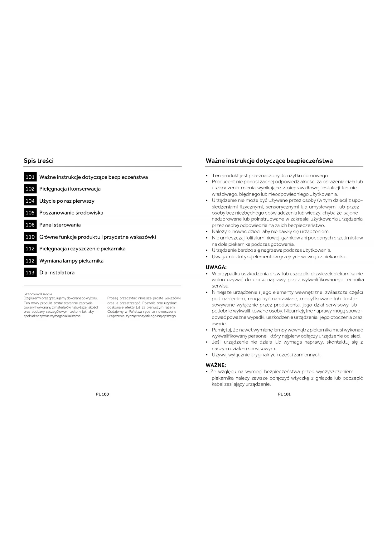 Szanowny Kliencie Dziękujemy oraz gratulujemy dokonanego wyboru. Ten nowy produkt został starannie zaprojek-towany i wykonany z materiałów najwyższej jakości oraz poddany szczegółowym testom tak, aby spełniał wszystkie wymagania kulinarne. Proszę przeczytać niniejsze proste wskazówki oraz je przestrzegać. Pozwolą one uzyskać doskonałe efekty już za pierwszym razem. Oddajemy w Państwa ręce to nowoczesne urządzenie, życząc wszystkiego najlepszego. PL 101 Ważne instrukcje dotyczące bezpieczeństwa