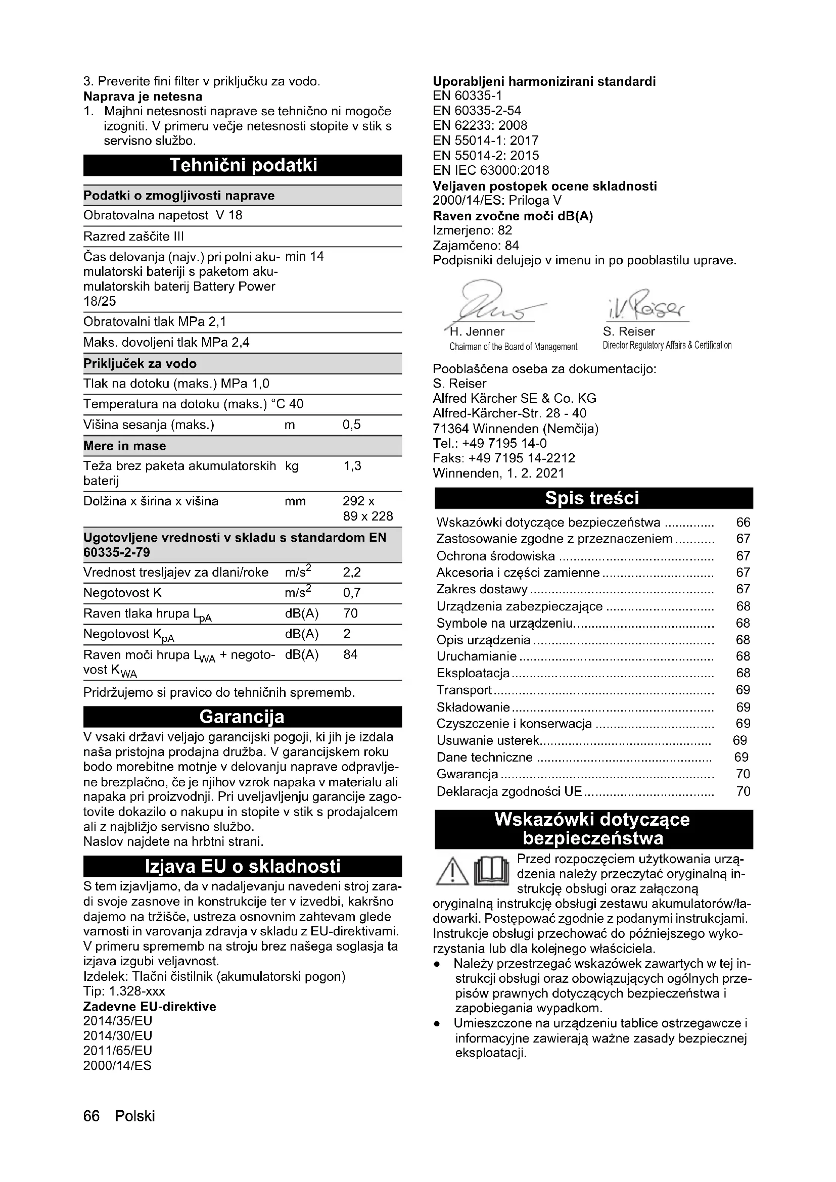 izogniti. V primeru večje netesnosti stopite v stik s servisno službo. Tehnični podatki Pridržujemo si pravico do tehničnih sprememb. Garancija V vsaki državi veljajo garancijski pogoji, ki jih je izdala naša pristojna prodajna družba. V garancijskem roku bodo morebitne motnje v delovanju naprave odpravlje- ne brezplačno, če je njihov vzrok napaka v materialu ali napaka pri proizvodnji. Pri uveljavljenju garancije zago- tovite dokazilo o nakupu in stopite v stik s prodajalcem ali z najbližjo servisno službo. Naslov najdete na hrbtni strani. Izjava EU o skladnosti S tem izjavljamo, da v nadaljevanju navedeni stroj zara- di svoje zasnove in konstrukcije ter v izvedbi, kakršno dajemo na tržišče, ustreza osnovnim zahtevam glede varnosti in varovanja zdravja v skladu z EU-direktivami. V primeru sprememb na stroju brez našega soglasja ta izjava izgubi veljavnost. Izdelek: Tlačni čistilnik (akumulatorski pogon) Tip: 1.328-xxx Zadevne EU-direktive 2014/35/EU 2014/30/EU 2011/65/EU 2000/14/ES Uporabljeni harmonizirani standardi EN 60335-1 EN 60335-2-54 EN 62233: 2008 EN 55014-1: 2017 EN 55014-2: 2015 EN IEC 63000:2018 Veljaven postopek ocene skladnosti 2000/14/ES: Priloga V Raven zvočne moči dB(A) Izmerjeno: 82 Zajamčeno: 84 Podpisniki delujejo v imenu in po pooblastilu uprave. Pooblaščena oseba za dokumentacijo: S. Reiser Alfred Kärcher SE & Co. KG Alfred-Kärcher-Str. 28 - 40 71364 Winnenden (Nemčija) Tel.: +49 7195 14-0 Faks: +49 7195 14-2212 Winnenden, 1. 2. 2021 Spis treści Wskazówki dotyczące bezpieczeństwa Przed rozpoczęciem użytkowania urzą- dzenia należy przeczytać oryginalną in- strukcję obsługi oraz załączoną oryginalną instrukcję obsługi zestawu akumulatorów/ła- dowarki. Postępować zgodnie z podanymi instrukcjami. Instrukcje obsługi przechować do późniejszego wyko- rzystania lub dla kolejnego właściciela. ● Należy przestrzegać wskazówek zawartych w tej in- strukcji obsługi oraz obowiązujących ogólnych prze- pisów prawnych dotyczących bezpieczeństwa i zapobiegania wypadkom. ● Umieszczone na urządzeniu tablice ostrzegawcze i informacyjne zawierają ważne zasady bezpiecznej eksploatacji. Podatki o zmogljivosti naprave Obratovalna napetost V 18 Razred zaščite III Čas delovanja (najv.) pri polni aku- mulatorski bateriji s paketom aku- mulatorskih baterij Battery Power 18/25 min 14 Obratovalni tlak MPa 2,1 Maks. dovoljeni tlak MPa 2,4 Priključek za vodo Tlak na dotoku (maks.) MPa 1,0 Temperatura na dotoku (maks.) °C 40 Višina sesanja (maks.) m 0,5 Mere in mase Teža brez paketa akumulatorskih baterij kg 1,3 Dolžina x širina x višina mm 292 x 89 x 228 Ugotovljene vrednosti v skladu s standardom EN 60335-2-79 Vrednost tresljajev za dlani/roke m/s