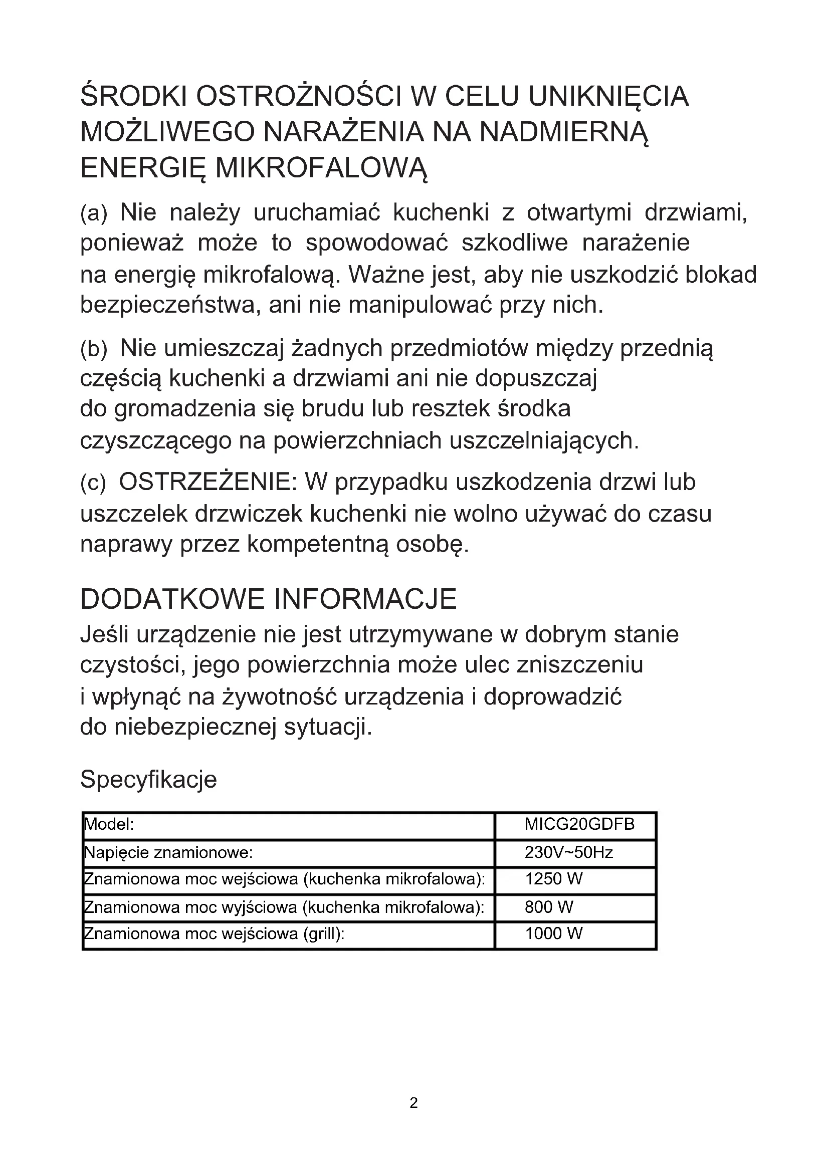 ENERGIĘ MIKROFALOWĄ (a) Nie należy uruchamiać kuchenki z otwartymi drzwiami, ponieważ może to spowodować szkodliwe narażenie na energię mikrofalową. Ważne jest, aby nie uszkodzić blokad bezpieczeństwa, ani nie manipulować przy nich. (b) Nie umieszczaj żadnych przedmiotów między przednią częścią kuchenki a drzwiami ani nie dopuszczaj do gromadzenia się brudu lub resztek środka czyszczącego na powierzchniach uszczelniających. (c) OSTRZEŻENIE: W przypadku uszkodzenia drzwi lub uszczelek drzwiczek kuchenki nie wolno używać do czasu naprawy przez kompetentną osobę. DODATKOWE INFORMACJE Jeśli urządzenie nie jest utrzymywane w dobrym stanie czystości, jego powierzchnia może ulec zniszczeniu i wpłynąć na żywotność urządzenia i doprowadzić do niebezpiecznej sytuacji. Specyfikacje Model: MICG20GDFB Napięcie znamionowe: 230V~50Hz Znamionowa moc wejściowa (kuchenka mikrofalowa): 1250 W Znamionowa moc wyjściowa (kuchenka mikrofalowa): 800 W Znamionowa moc wejściowa (grill): 1000 W3
