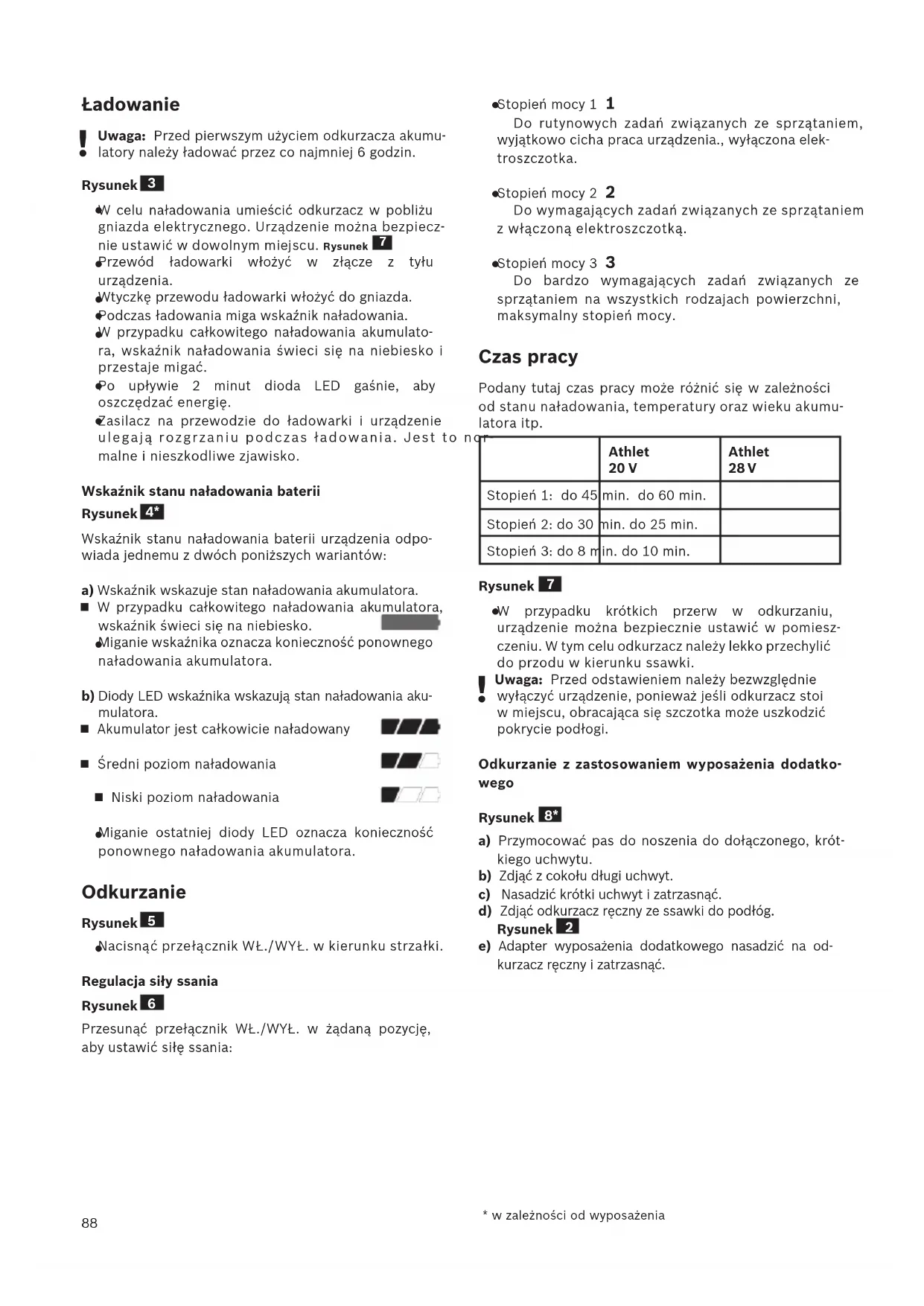 Stopień mocy 3 3 Do bardzo wymagających zadań związanych ze sprzątaniem na wszystkich rodzajach powierzchni, maksymalny stopień mocy. Czas pracy Podany tutaj czas pracy może różnić się w zależności od stanu naładowania, temperatury oraz wieku akumu- latora itp. Athlet 20 V Athlet 28 V Stopień 1: do 45 min. do 60 min. Stopień 2: do 30 min. do 25 min. Stopień 3: do 8 min. do 10 min. Rysunek
