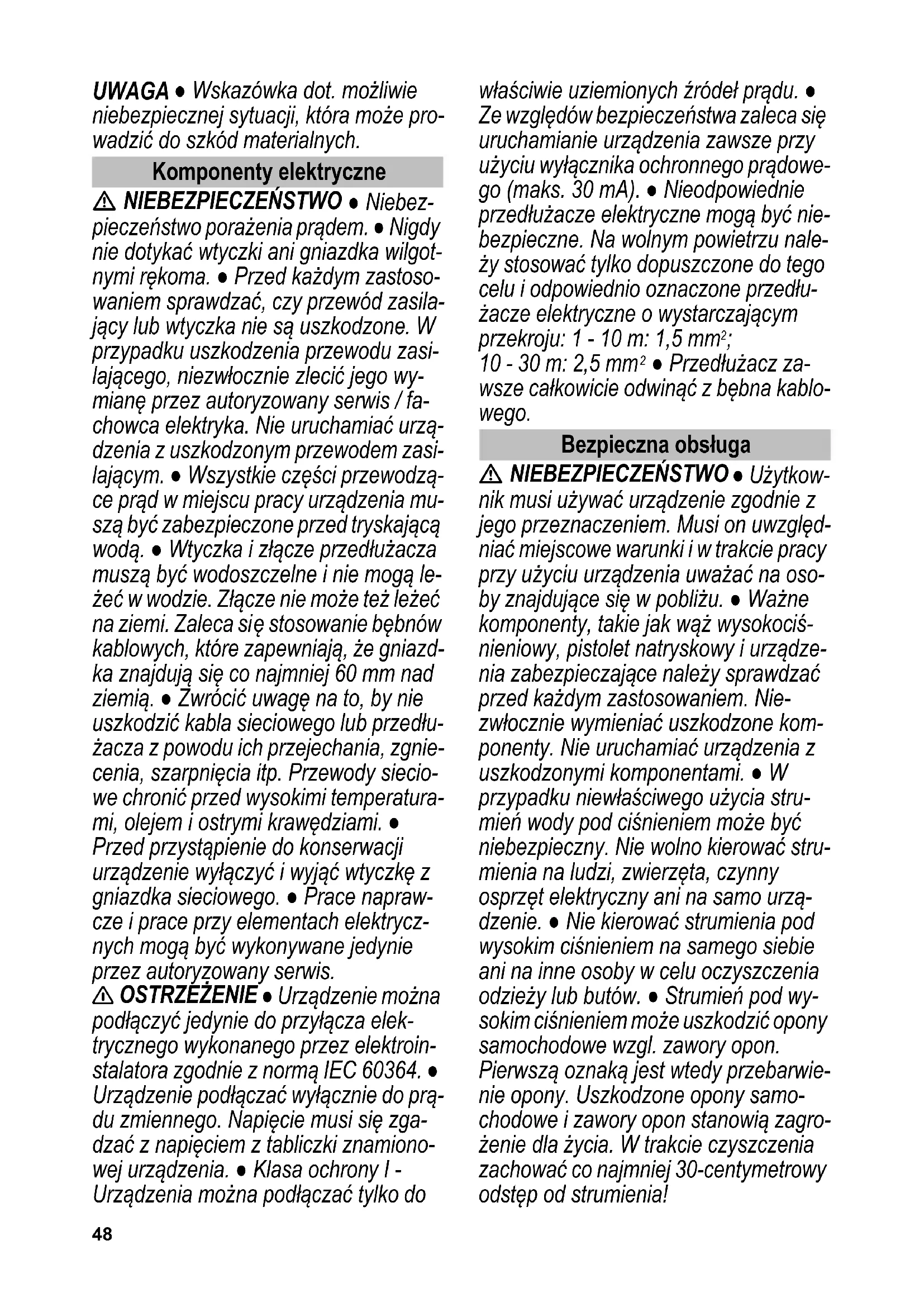 NIEBEZPIECZEŃSTWO ● Użytkow- nik musi używać urządzenie zgodnie z jego przeznaczeniem. Musi on uwzględ- niać miejscowe warunki i w trakcie pracy przy użyciu urządzenia uważać na oso- by znajdujące się w pobliżu. ● Ważne komponenty, takie jak wąż wysokociś- nieniowy, pistolet natryskowy i urządze- nia zabezpieczające należy sprawdzać przed każdym zastosowaniem. Nie- zwłocznie wymieniać uszkodzone kom- ponenty. Nie uruchamiać urządzenia z uszkodzonymi komponentami. ● W przypadku niewłaściwego użycia stru- mień wody pod ciśnieniem może być niebezpieczny. Nie wolno kierować stru- mienia na ludzi, zwierzęta, czynny osprzęt elektryczny ani na samo urzą- dzenie. ● Nie kierować strumienia pod wysokim ciśnieniem na samego siebie ani na inne osoby w celu oczyszczenia odzieży lub butów. ● Strumień pod wy- sokim ciśnieniem może uszkodzić opony samochodowe wzgl. zawory opon. Pierwszą oznaką jest wtedy przebarwie- nie opony. Uszkodzone opony samo- chodowe i zawory opon stanowią zagro- żenie dla życia. W trakcie czyszczenia zachować co najmniej 30-centymetrowy odstęp od strumienia! Komponenty elektryczne Bezpieczna obsługa49