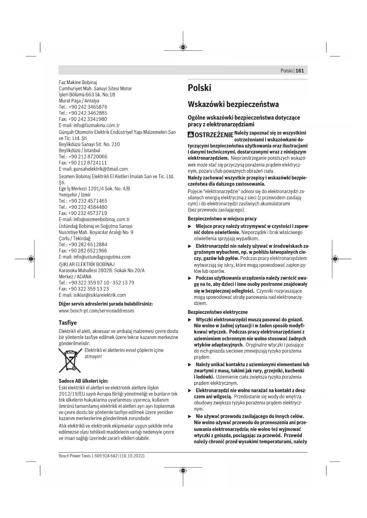 Karasoku Mahallesi 28028. Sokak No:20/A Merkez / ADANA Tel.: +903223599710 -3521379 Fax: +903223591323 E-mail: isiklar@isiklarelektrik.com Diğer servis adreslerini şurada bulabilirsiniz: www.bosch-pt.com/serviceaddresses Tasfiye Elektrikli el aleti, aksesuar ve ambalaj malzemesi çevre dostu bir yöntemle tasfiye edilmek üzere tekrar kazanım merkezine gönderilmelidir. Elektrikli el aletlerini evsel çöplerin içine atmayın! Sadece AB ülkeleri için: Eski elektrikli el aletleri ve elektronik aletlere ilişkin 2012/19/EU sayılı Avrupa Birliği yönetmeliği ve bunların tek tek ülkelerin hukuklarına uyarlanması uyarınca, kullanım ömrünü tamamlamış elektrikli el aletleri ayrı ayrı toplanmak ve çevre dostu bir yöntemle tasfiye edilmek üzere yeniden kazanım merkezlerine gönderilmek zorundadır. Atık elektrikli ve elektronik ekipmanlar uygun şekilde imha edilmezse olası tehlikeli maddelerin varlığı nedeniyle çevre ve insan sağlığı üzerinde zararlı etkileri olabilir. Polski Wskazówki bezpieczeństwa Ogólne wskazówki bezpieczeństwa dotyczące pracy z elektronarzędziami OSTRZEŻENIE Należy zapoznać się ze wszystkimi ostrzeżeniami i wskazówkami do- tyczącymi bezpieczeństwa użytkowania oraz ilustracjami i danymi technicznymi, dostarczonymi wraz z niniejszym elektronarzędziem. Nieprzestrzeganie poniższych wskazó- wek może stać się przyczyną porażenia prądem elektrycz- nym, pożaru i/lub poważnych obrażeń ciała. Należy zachować wszystkie przepisy i wskazówki bezpie- czeństwa dla dalszego zastosowania. Pojęcie "elektronarzędzie" odnosi się do elektronarzędzi za- silanych energią elektryczną z sieci (z przewodem zasilają- cym) i do elektronarzędzi zasilanych akumulatorami (bezprzewodu zasilającego). Bezpieczeństwo w miejscu pracy u Miejsce pracy należy utrzymywać w czystości i zapew- nić dobre oświetlenie. Nieporządek i brak właściwego oświetlenia sprzyjają wypadkom. u Elektronarzędzi nie należy używać w środowiskach za- grożonym wybuchem, np. w pobliżu łatwopalnych cie- czy, gazów lub pyłów. Podczas pracy elektronarzędziem wytwarzają się iskry, które mogą spowodować zapłon py- łów lub oparów. u Podczas użytkowania urządzenia należy zwrócić uwa- gę na to, aby dzieci i inne osoby postronne znajdowały się w bezpiecznej odległości. Czynniki rozpraszające mogą spowodować utratę panowania nad elektronarzę- dziem. Bezpieczeństwo elektryczne u Wtyczki elektronarzędzi muszą pasować do gniazd. Nie wolno w żadnej sytuacji i w żaden sposób modyfi- kować wtyczek. Podczas pracy elektronarzędziami z uziemieniem ochronnym nie wolno stosować żadnych wtyków adaptacyjnych. Oryginalne wtyczki i pasujące do nich gniazda sieciowe zmniejszają ryzyko porażenia prądem. u Należy unikać kontaktu z uziemionymi elementami lub zwartymi z masą, takimi jak rury, grzejniki, kuchenki ilodówki. Uziemienie ciała zwiększa ryzyko porażenia prądem elektrycznym. u Elektronarzędzi nie wolno narażać na kontakt z desz- czem ani wilgocią. Przedostanie się wody do wnętrza obudowy zwiększa ryzyko porażenia prądem elektrycz- nym. u Nie używać przewodu zasilającego do innych celów. Nie wolno używać przewodu do przenoszenia ani prze- suwania elektronarzędzia; nie wolno też wyjmować wtyczki z gniazda, pociągając za przewód. Przewód należy chronić przed wysokimi temperaturami, należy Bosch Power Tools 1 609 92A 6A2 | (10.10.2022)162 | Polski go trzymać zdala od oleju, ostrych krawędzi i rucho- mych części urządzenia. Uszkodzone lub splątane prze- wody zwiększają ryzyko porażenia prądem elektrycznym. u Używając elektronarzędzia na świeżym powietrzu, na- leży upewnić się, że przedłużacz jest przeznaczony do pracy na zewnątrz. Użycie przedłużacza przeznaczone- go do pracy na zewnątrz zmniejsza ryzyko porażenia prą- dem elektrycznym. u Jeżeli nie ma innej możliwości, niż użycie elektrona- rzędzia w wilgotnym otoczeniu, należy podłączyć je do źródła zasilania wyposażonego w wyłącznik ochronny różnicowoprądowy. Zastosowanie wyłącznika ochron- nego różnicowoprądowego zmniejsza ryzyko porażenia prądem elektrycznym. Bezpieczeństwo osób u Podczas pracy z elektronarzędziem należy zachować czujność, każdą czynność wykonywać ostrożnie i z rozwagą. Nie przystępować do pracy elektronarzę- dziem w stanie zmęczenia lub będąc pod wpływem narkotyków, alkoholu lub leków. Chwila nieuwagi pod- czas pracy może grozić bardzo poważnymi obrażeniami ciała. u Stosować środki ochrony osobistej. Należy zawsze nosić okulary ochronne. Środki ochrony osobistej, np. maska przeciwpyłowa, antypoślizgowe obuwie, kask ochronny czy ochraniacze na uszy, w określonych warun- kach pracy obniżają ryzyko obrażeń ciała. u Należy unikać niezamierzonego uruchomienia narzę- dzia. Przed podłączeniem elektronarzędzia do źródła zasilania i/lub podłączeniem akumulatora, podniesie- niem albo transportem urządzenia, należy upewnić się, że włącznik elektronarzędzia znajduje się w pozy- cji wyłączonej. Przenoszenie elektronarzędzia z palcem opartym na włączniku/wyłączniku lub włożenie do gniaz- da sieciowego wtyczki włączonego narzędzia, może stać się przyczyną wypadków. u Przed włączeniem elektronarzędzia należy usunąć wszystkie narzędzia nastawcze i klucze maszynowe. Narzędzia lub klucze, pozostawione wruchomych czę- ściach urządzenia, mogą spowodować obrażenia ciała. u Należy unikać nienaturalnych pozycji przy pracy. Na- leży dbać o stabilną pozycję przy pracy i zachowanie równowagi. Dzięki temu można będzie łatwiej zapano- wać nad elektronarzędziem w nieprzewidzianych sytu- acjach. u Należy nosić odpowiednią odzież. Nie należy nosić luźnej odzieży ani biżuterii. Włosy i odzież należy trzy- mać z dala od ruchomych części. Luźna odzież, biżuteria lub długie