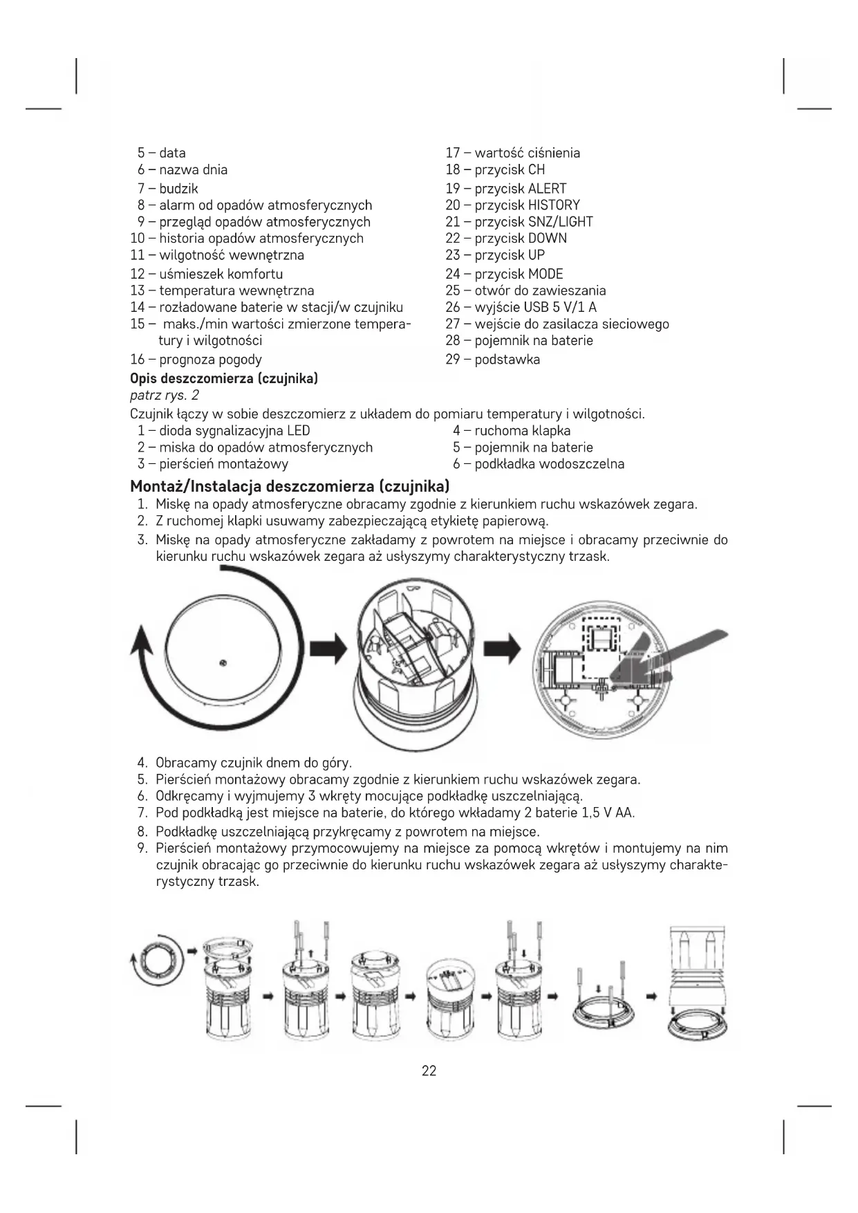 - Tento prístroj nie je určený na používanie osobami (vrátane detí), ktorým fyzická, zmyslová alebo mentálna neschopnosť či nedostatok skúseností a znalostí zabraňuje v bezpečnom používaní prístroja, pokiaľ na ne nebude dohliadané alebo pokiaľ neboli inštruované ohľadom použitia tohto prístroja osobou zodpovednou za ich bezpečnosť. Nevyhadzujte elektrické spotrebiče ako netriedený komunálny odpad, použite zberné miesta triedeného odpadu. Pre aktuálne informácie o zberných miestach kontaktujte miestne úrady. Pokiaľ sú elektrické spotrebiče uložené na skládkach odpadkov, nebezpečné látky môžu pre- sakovať do podzemnej vody a dostať sa do potravinového reťazca a poškodzovať vaše zdravie. EMOS spol. s r. o. týmto vyhlasuje, že rádiové zariadenie typu E8670 je v súlade so smer- nicou 2014/53/EÚ. Úplné EÚ vyhlásenie o zhode je k dispozícii na tejto internetovej adrese: http://www.emos.eu/download. PL | Bezprzewodowa stacja meteorologiczna Przed uruchomieniem wyrobu prosimy uważnie przeczytać tę instrukcję. Specykacja zegar sterowany sygnałem radiowym format czasu: 12/24 godz. temperatura wewnętrzna: -10°C do +50°C, rozdzielczość 0,1°C temperatura zewnętrzna: -30°C do +60°C, rozdzielczość 0,1°C dokładność pomiaru temperatury: ±1°C w granicach 0°C do +50°C, ±2°C w granicach -20°C do +0°C, ±4°C w granicach -40°C do -20°C wilgotność wewnętrzna i zewnętrzna wilgotność: 10% do 99% RV, rozdzielczość 1% dokładność pomiaru wilgotności: ±5% w granicach 30% do 50% RV, ±10% w granicach 10% do 29% i 51% do 99% RV zakres pomiarowy ciśnienia atmosferycznego: 800 do 1 100 hPa jednostka ciśnienia: hPa/inHg zakres pomiarowy czujnika opadów atmosferycznych: 0–999,9 mm zasięg sygnału radiowego: do 50 m na wolnej przestrzeni częstotliwość transmisji: 433 MHz, 10 mW e.r.p. maks. liczba czujników: maks. 1 zasilanie: stacja główna: 3 baterie: 1,5 V AAA (nie ma w komplecie) zasilacz: AC 230 V/DC 5 V, 1000 mA (w komplecie) czujnik: 2 baterie 1,5 V AA (nie ma w komplecie) wymiary: stacja główna: 29 × 205 × 127 mm czujnik: 117 × 117 × 164 mm Stacja meteorologiczna – opis wyświetlacza i przycisków patrz rys. 1 1 – temperatura zewnętrzna 2 – wilgotność zewnętrzna 3 – wykres historii ciśnienia / temperatury zewnętrznej / wilgotności zewnętrznej 4 – czas/odbiór sygnału DCF22 5 – data 6 – nazwa dnia 7 – budzik 8 – alarm od opadów atmosferycznych 9 – przegląd opadów atmosferycznych 10 – historia opadów atmosferycznych 11 – wilgotność wewnętrzna 12 – uśmieszek komfortu 13 – temperatura wewnętrzna 14 – rozładowane baterie w stacji/w czujniku 15 – maks./min wartości zmierzone tempera- tury i wilgotności 16 – prognoza pogody 17 – wartość ciśnienia 18 – przycisk CH 19 – przycisk ALERT 20 – przycisk HISTORY 21 – przycisk SNZ/LIGHT 22 – przycisk DOWN 23 – przycisk UP 24 – przycisk MODE 25 – otwór do zawieszania 26 – wyjście USB 5 V/1 A 27 – wejście do zasilacza sieciowego 28 – pojemnik na baterie 29 – podstawka Opis deszczomierza (czujnika) patrz rys. 2 Czujnik łączy w sobie deszczomierz z układem do pomiaru temperatury i wilgotności. 1 – dioda sygnalizacyjna LED 2 – miska do opadów atmosferycznych 3 – pierścień montażowy 4 – ruchoma klapka 5 – pojemnik na baterie 6 – podkładka wodoszczelna Montaż/Instalacja deszczomierza (czujnika)