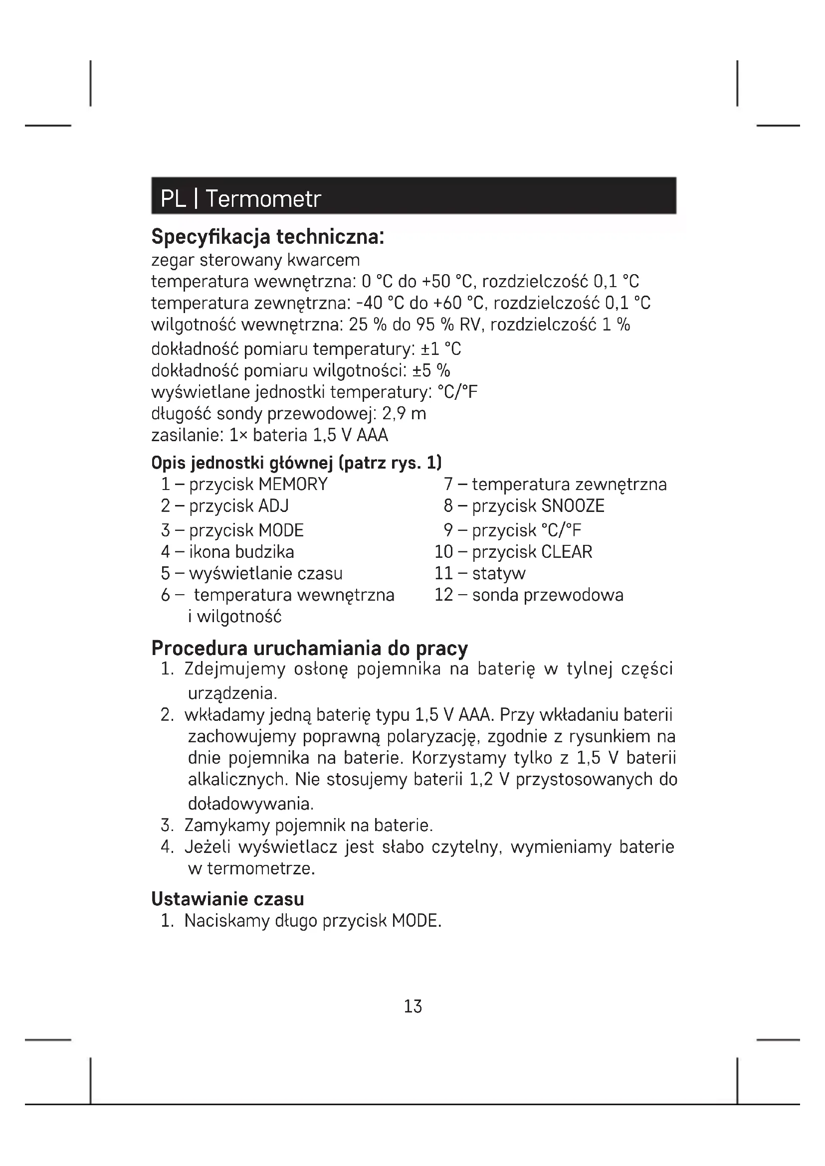 - To urządzenie nie jest przeznaczone do użytkowania przez osoby (w tym dzieci), którym brak predyspozycji zycznych, umysło- wych albo mentalnych oraz brak wiedzy albo doświadczenia uniemożliwia bezpieczne korzystanie z tego wyrobu, jeżeli nie jest nad nimi sprawowany nadzór albo, jeżeli nie zostały poin- struowane, co do zasad korzystania z tego produktu przez osobę, która jest odpowiedzialna za ich bezpieczeństwo. Zgodnie z przepisami Ustawy o ZSEiE zabronione jest umiesz- czanie łącznie z innymi odpadami zużytego sprzętu oznako- wanego symbolem przekreślonego kosza. Użytkownik, chcąc pozbyć się sprzętu elektronicznego i elektrycznego, jest zo- bowiązany do oddania go do punktu zbierania zużytego sprzętu. W sprzęcie nie znajdują się składniki niebezpieczne, które mają szcze- gólnie negatywny wpływ na środowisko i zdrowie ludzi. HU | Hőmérő Műszaki jellemzők: Kvarckristály vezérlésű óra beltéri hőmérséklet: 0 °C és +50 °C között 0,1 °C lépésközzel külső hőmérséklet: -40 °C és +60 °C között 0,1 °C lépésközzel beltéri páratartalom: relatív páratartalom: 25 % és 95 % között 1 % lépésközzel hőmérséklet-mérési pontosság: ±1 °C páratartalom-mérési pontosság: ±5 % kijelzett hőmérsékleti mértékegységek: °C/°F vezetékes szonda hossza: 2,9 m tápellátás: 1 db 1,5 V AAA elem A fő egység leírása (l. 1. ábra) 1 – MEMORY (memória) gomb 2 – ADJ (beállítás) gomb 3 – MODE (mód) gomb 4 – ébresztő szimbólum 5 – óra megjelenítése 6 – beltéri hőmérséklet és páratartalom17 7 – külső hőmérséklet 8 – SNOOZE (szundi) gomb 9 – °C/°F gomb 10 – CLEAR (törlés) gomb 11 – kitámasztó 12 – vezetékes szonda Az üzembehelyezés menete