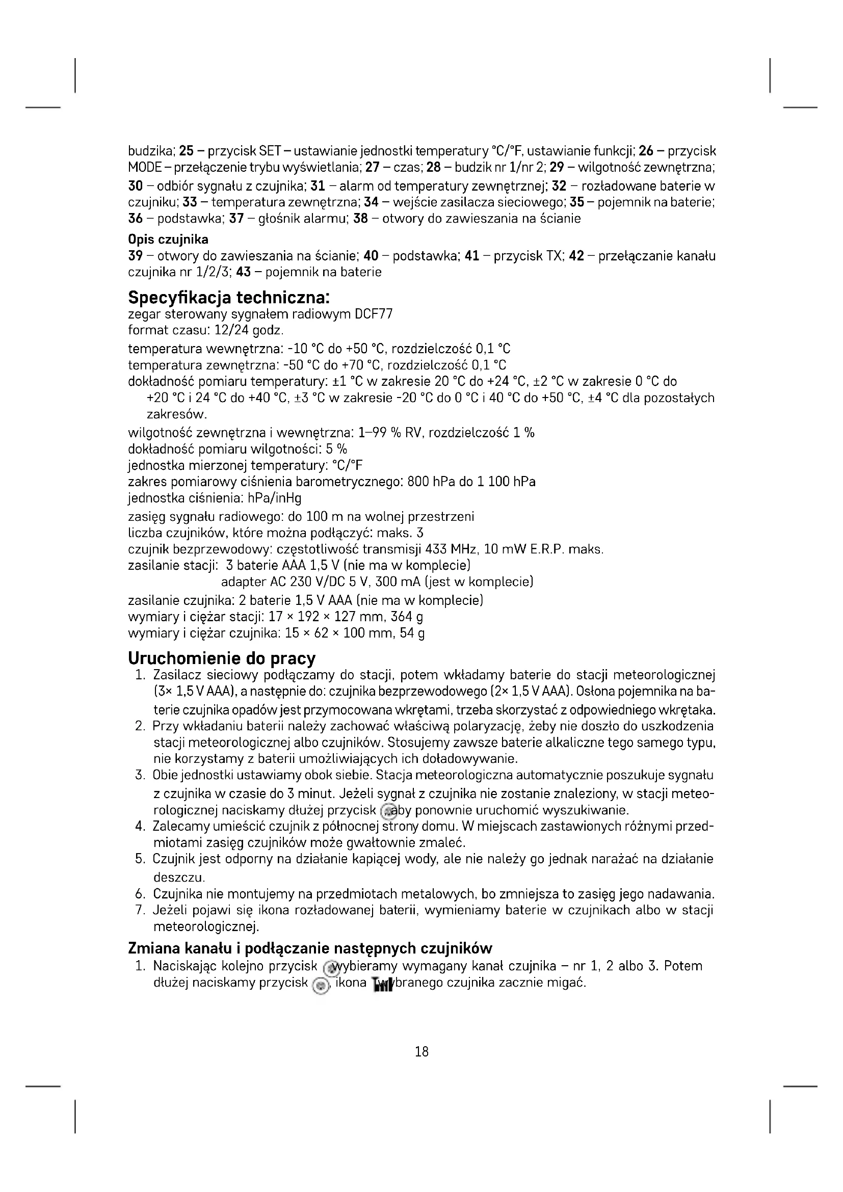- Tento prístroj nie je určený pre používanie osobami (vrátane detí), ktorým fyzická, zmyslová alebo mentálna neschopnosť či nedostatok skúseností a znalostí zabraňuje v bezpečnom používaní prístroja, pokiaľ na ne nebude dohliadané alebo pokiaľ neboli inštruované ohľadne použitia tohto prístroja osobou zodpovednou za ich bezpečnosť. Je nutný dohľad nad deťmi, aby sa zabezpečilo, že si nebudú s prístrojom hrať. Zariadenie a batérie sa po použití stávajú nebezpečným odpadom, nevyhadzujte ich do bežného komunálneho odpadu, ale odovzdajte ich na mieste spätného odberu – napr. v obchode, kde ste prístroj zakúpili. Nevyhadzujte elektrické spotrebiče ako netriedený komunálny odpad, použite zberné miesta triedeného odpadu. Pre aktuálne informácie o zberných miestach kontaktujte miestne úrady. Pokiaľ sú elektrické spotrebiče uložené na skládkach odpadkov, nebezpečné látky môžu pre- sakovať do podzemnej vody a dostať sa do potravinového reťazca a poškodzovať vaše zdravie. EMOS spol. s r. o. týmto vyhlasuje, že rádiové zariadenie typu E6018 je v súlade so smer- nicou 2014/53/EÚ. Úplné EÚ vyhlásenie o zhode je k dispozícii na tejto internetovej adrese: http://www.emos.eu/download. PL | Bezprzewodowa stacja meteorologiczna Wskazania na wyświetlaczu stacji meteorologicznej – ikony i przyciski: 1 – przycisk snooze/light; 2 – numer czujnika 1/2/3; 3 – dane z czujnika zewnętrznego; 4 – rotacja da- nych z podłączonych czujników; 5 – trend temperatury zewnętrznej; 6 – trend wilgotności zewnętrznej; 7 – prognoza pogody; 8 – fazy Księżyca; 9 – historia ciśnienia; 10 – wartość ciśnienia; 11 – trend ciśnie- nia; 12 – alarm od temperatury wewnętrznej; 13 – temperatura wewnętrzna; 14 – trend temperatury wewnętrznej; 15 – rozładowane baterie w stacji; 16 – trend wilgotności wewnętrznej; 17 – wilgotność wewnętrzna; 18 – data; 19 – dzień w tygodniu; 20 – przycisk UP – krok do przodu przy ustawianiu, pamięć Maks./Min temperatury i wilgotności; 21 – przycisk DOWN – krok do tyłu przy ustawianiu; 22 – przycisk CHANNEL – wyszukiwanie sygnału z czujnika/przełączanie danych z podłączonych czujników; 23 – odbiór sygnału DCF, czas letni (DST); 24 – przycisk ALARM – włączenie/wyłączenie18 budzika; 25 – przycisk SET – ustawianie jednostki temperatury °C/°F, ustawianie funkcji; 26 – przycisk MODE – przełączenie trybu wyświetlania; 27 – czas; 28 – budzik nr 1/nr 2; 29 – wilgotność zewnętrzna; 30 – odbiór sygnału z czujnika; 31 – alarm od temperatury zewnętrznej; 32 – rozładowane baterie w czujniku; 33 – temperatura zewnętrzna; 34 – wejście zasilacza sieciowego; 35 – pojemnik na baterie; 36 – podstawka; 37 – głośnik alarmu; 38 – otwory do zawieszania na ścianie Opis czujnika 39 – otwory do zawieszania na ścianie; 40 – podstawka; 41 – przycisk TX; 42 – przełączanie kanału czujnika nr 1/2/3; 43 – pojemnik na baterie Specykacja techniczna: zegar sterowany sygnałem radiowym DCF77 format czasu: 12/24 godz. temperatura wewnętrzna: -10°C do +50°C, rozdzielczość 0,1°C temperatura zewnętrzna: -50°C do +70°C, rozdzielczość 0,1°C dokładność pomiaru temperatury: ±1°C w zakresie 20°C do +24°C, ±2°C w zakresie 0°C do +20°C i 24°C do +40°C, ±3°C w zakresie -20°C do 0°C i 40°C do +50°C, ±4°C dla pozostałych zakresów. wilgotność zewnętrzna i wewnętrzna: 1–99 % RV, rozdzielczość 1 % dokładność pomiaru wilgotności: 5 % jednostka mierzonej temperatury: °C/°F zakres pomiarowy ciśnienia barometrycznego: 800 hPa do 1 100 hPa jednostka ciśnienia: hPa/inHg zasięg sygnału radiowego: do 100 m na wolnej przestrzeni liczba czujników, które można podłączyć: maks. 3 czujnik bezprzewodowy: częstotliwość transmisji 433 MHz, 10 mW E.R.P. maks. zasilanie stacji: 3 baterie AAA 1,5 V (nie ma w komplecie) adapter AC 230 V/DC 5 V, 300 mA (jest w komplecie) zasilanie czujnika: 2 baterie 1,5 V AAA (nie ma w komplecie) wymiary i ciężar stacji: 17 × 192 × 127 mm, 364 g wymiary i ciężar czujnika: 15 × 62 × 100 mm, 54 g Uruchomienie do pracy