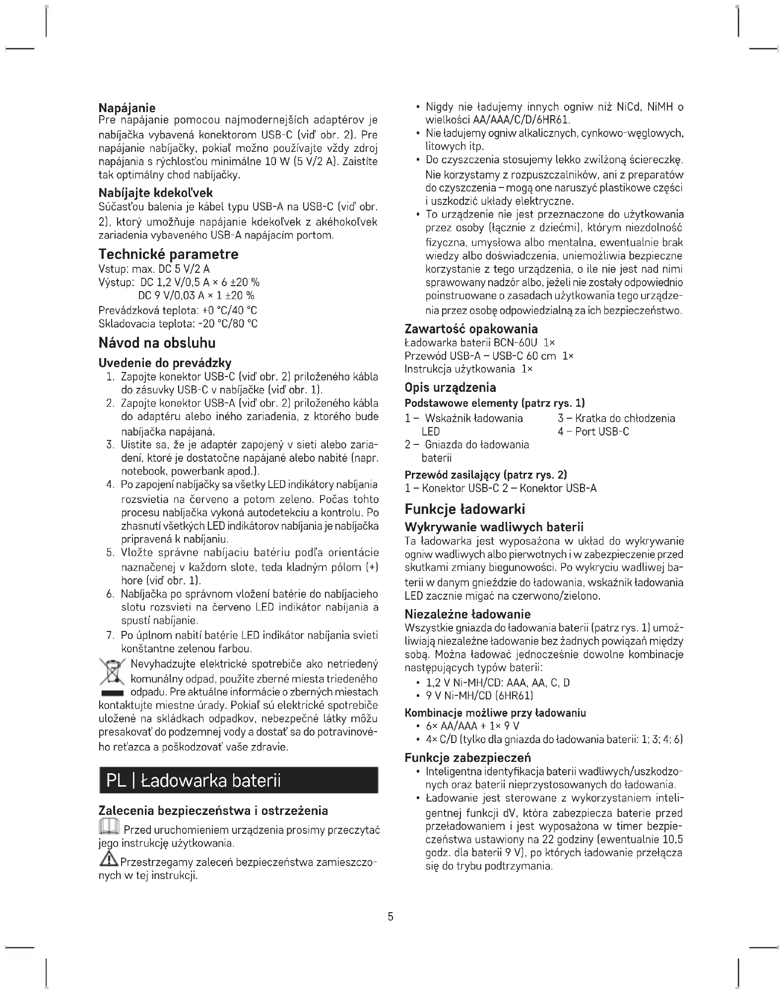 - To urządzenie nie jest przeznaczone do użytkowania przez osoby (łącznie z dziećmi), którym niezdolność zyczna, umysłowa albo mentalna, ewentualnie brak wiedzy albo doświadczenia, uniemożliwia bezpieczne korzystanie z tego urządzenia, o ile nie jest nad nimi sprawowany nadzór albo, jeżeli nie zostały odpowiednio poinstruowane o zasadach użytkowania tego urządze- nia przez osobę odpowiedzialną za ich bezpieczeństwo. Zawartość opakowania Ładowarka baterii BCN-60U 1× Przewód USB-A – USB-C 60 cm 1× Instrukcja użytkowania 1× Opis urządzenia Podstawowe elementy (patrz rys. 1) 1 – Wskaźnik ładowania LED 2 – Gniazda do ładowania baterii 3 – Kratka do chłodzenia 4 – Port USB-C Przewód zasilający (patrz rys. 2) 1 – Konektor USB-C 2 – Konektor USB-A Funkcje ładowarki Wykrywanie wadliwych baterii Ta ładowarka jest wyposażona w układ do wykrywanie ogniw wadliwych albo pierwotnych i w zabezpieczenie przed skutkami zmiany biegunowości. Po wykryciu wadliwej ba- terii w danym gnieździe do ładowania, wskaźnik ładowania LED zacznie migać na czerwono/zielono. Niezależne ładowanie Wszystkie gniazda do ładowania baterii (patrz rys. 1) umoż- liwiają niezależne ładowanie bez żadnych powiązań między sobą. Można ładować jednocześnie dowolne kombinacje następujących typów baterii: