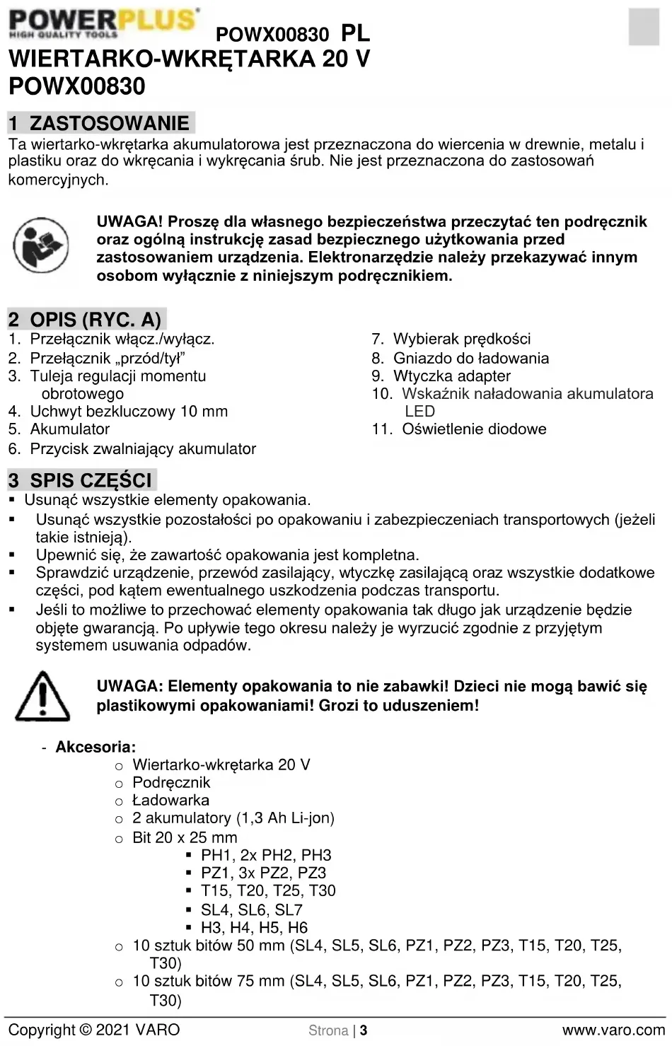 - Nie wolno przeciążać elektronarzędzi. Należy używać właściwego elektronarzędzia dla zamierzonych prac. Właściwe elektronarzędzie pozwoli na lepsze i bezpieczniejsze wykonanie pracy przy takim obciążeniu, do jakiego zostało zaprojektowane.POWX00830 PL Copyright © 2021 VARO Strona | 6 www.varo.com