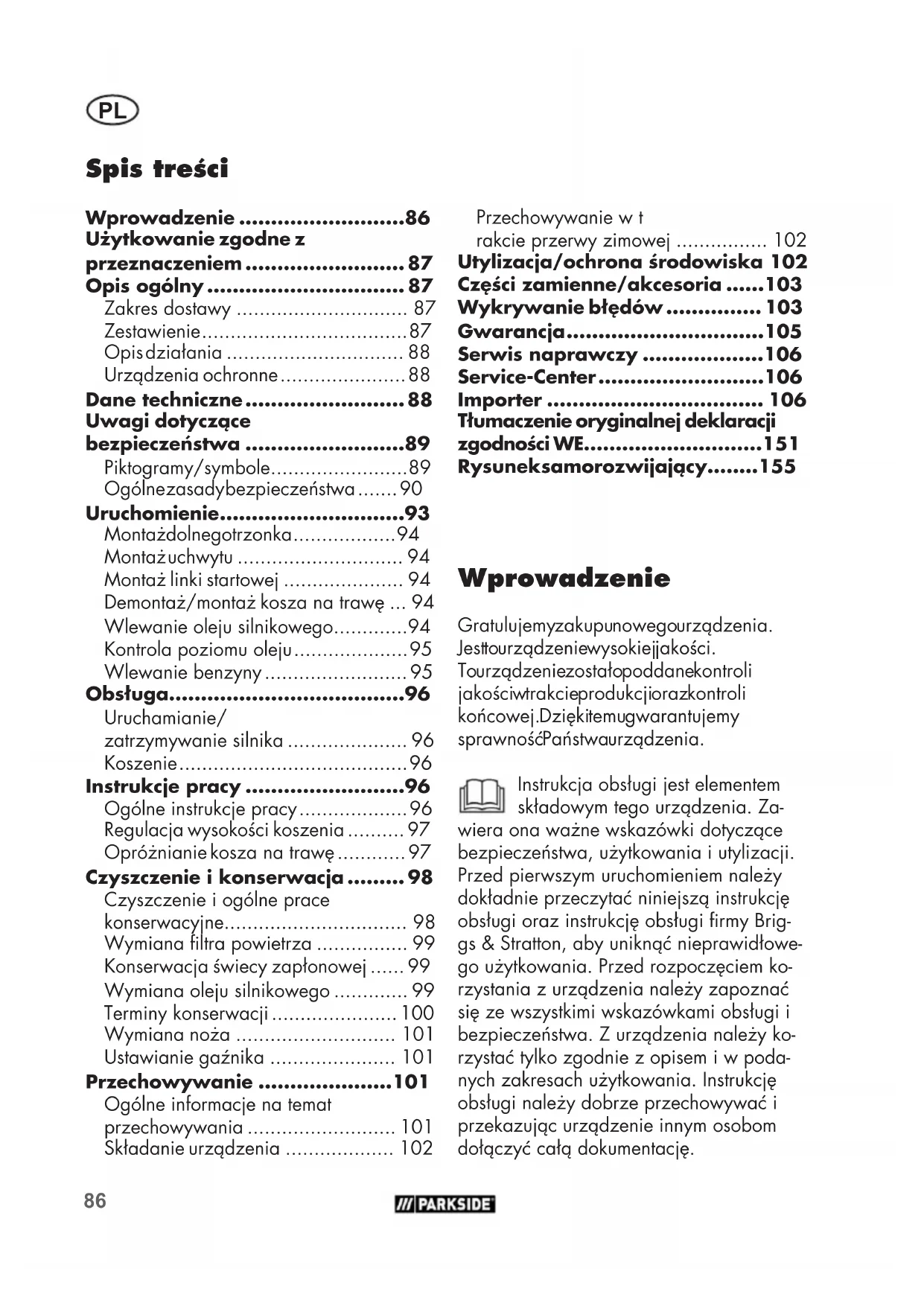 - Rysunek samorozwijający Wprowadzenie Gratulujemy zakupu nowego urządzenia. Jest to urządzenie wysokiej jakości. To urządzenie zostało poddane kontroli jakości w trakcie produkcji oraz k ontroli końc owej. Dzięki temu gwarantujemy sprawność P aństwa urządzenia. Instrukcja obsługi jest elementem składowym tego urządzenia. Za- wiera ona ważne wskazówki dotyczące bezpieczeństwa, użytkowania i utylizacji. Przed pierwszym uruchomieniem należy dokładnie przeczytać niniejszą instrukcję obsługi oraz instrukcję obsługi rmy Brig- gs& Stratton, aby uniknąć nieprawidłowe- go użytkowania. Przed rozpoczęciem ko- rzystania z urządzenia należy zapoznać się ze wszystkimi wskazówkami obsługi i bezpieczeństwa. Z urządzenia należy ko- rzystać tylko zgodnie z opisem i w poda- nych zakresach użytkowania. Instrukcję obsługi należy dobrze przechowywać i przekazując urządzenie innym osobom dołączyć całą dokumentację.87 p. 155