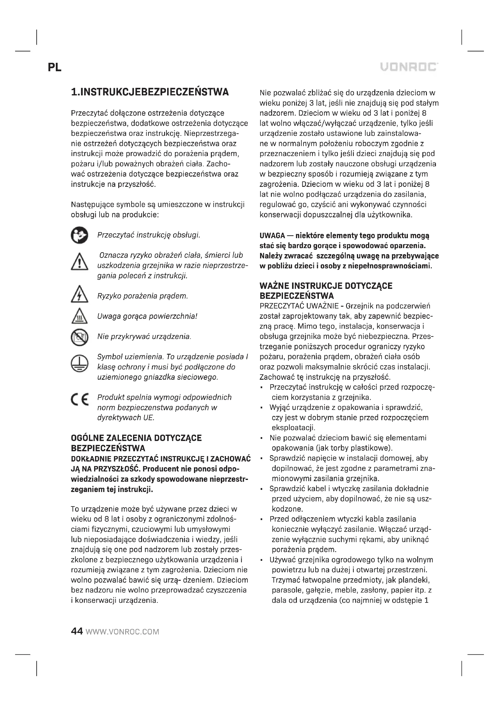 BEZPIECZEŃSTWA PRZECZYTAĆ UWAŻNIE - Grzejnik na podczerwień został zaprojektowany tak, aby zapewnić bezpiec- zną pracę. Mimo tego, instalacja, konserwacja i obsługa grzejnika może być niebezpieczna. Przes- trzeganie poniższych procedur ograniczy ryzyko pożaru, porażenia prądem, obrażeń ciała osób oraz pozwoli maksymalnie skrócić czas instalacji. Zachować tę instrukcję na przyszłość.