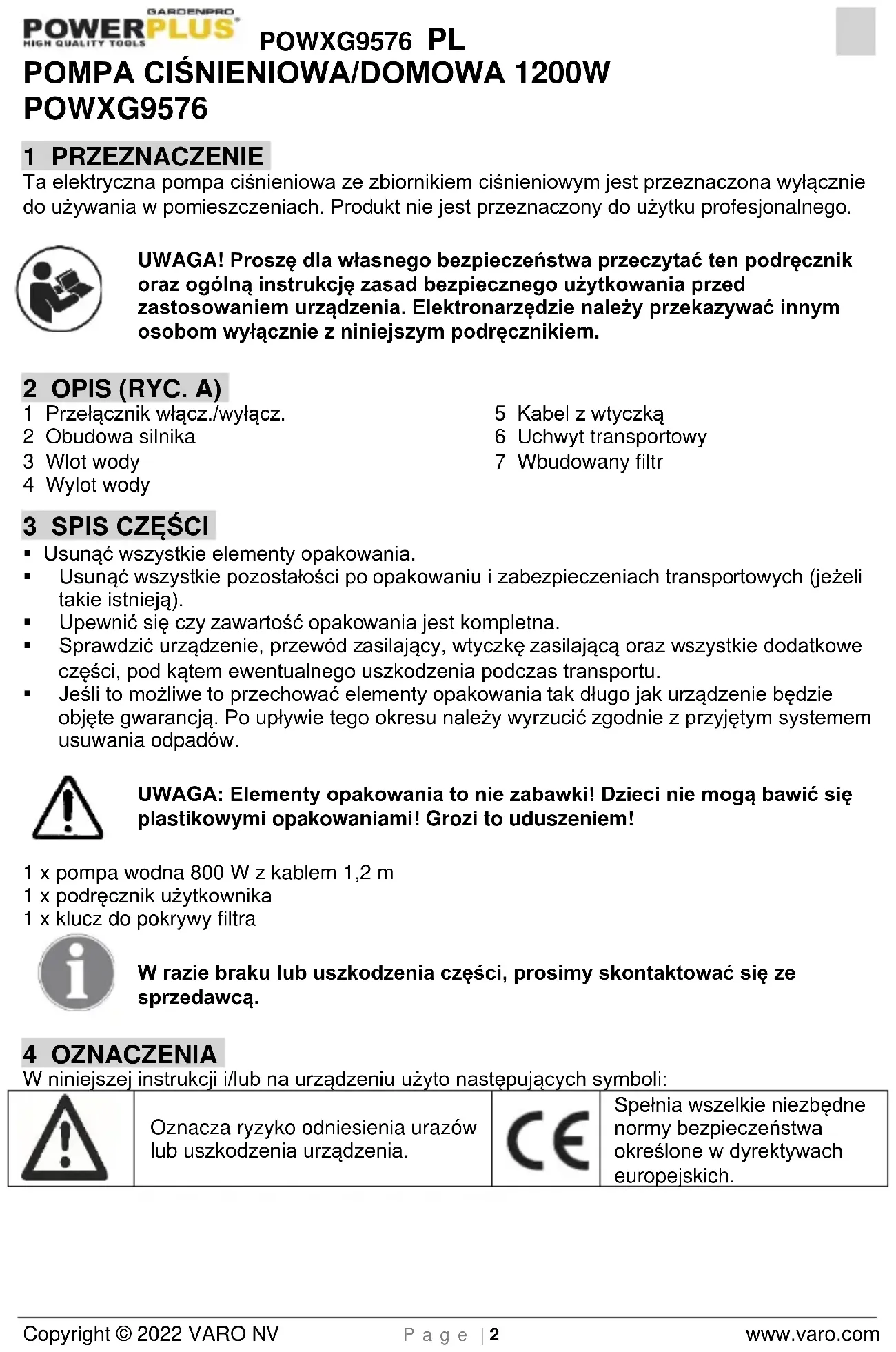 Spełnia wszelkie niezbędne normy bezpieczeństwa określone w dyrektywach europejskich.POWXG9576 PL Copyright © 2022 VARO NV P a g e | 3 www.varo.com