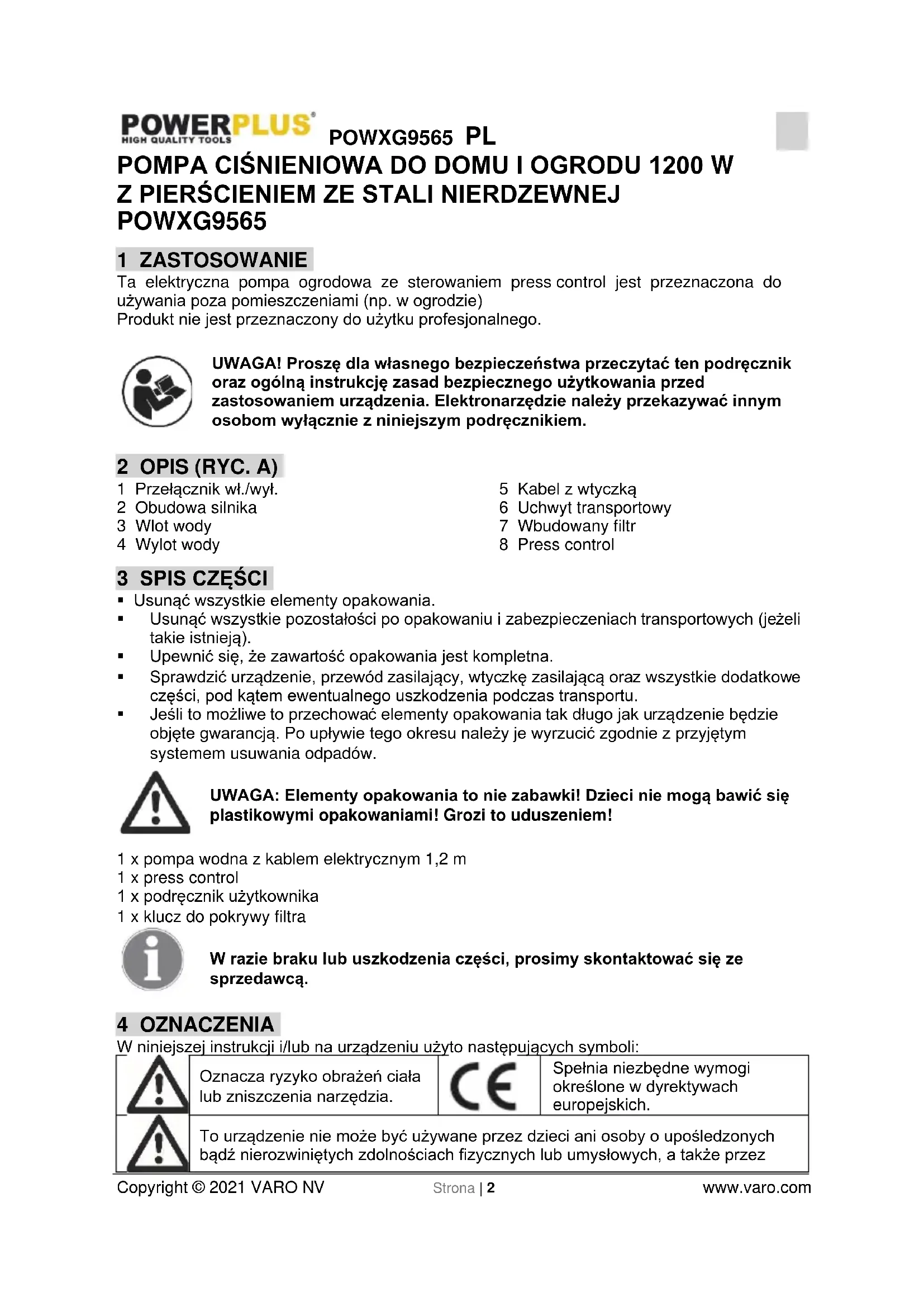 VARO N.V. - Vic. Van Rompuy N.V.- Joseph Van Instraat 9 - BE2500 Lier - BELGIA oświadcza, że produkt: Pompa ciśnieniowa do domu i ogrodu 1200 W z pierścieniem ze stali nierdzewnej znak towarowy: POWERplus model: POWXG9565 spełnia niezbędne wymogi i inne stosowne postanowienia odpowiednich dyrektyw europejskich, opartych na zastosowaniu europejskich norm zharmonizowanych. Wszelkie nieuprawnione modyfikacje urządzenia spowodują unieważnienie niniejszej deklaracji. Dyrektywy europejskie (wraz z ewentualnymi zmianami): 2014/30/WE 2014/35/WE 2011/65/UE 2000/14/EC Annex V LwA Measured 82dB(A) Guaranteed 83dB(A) Europejskie normy zharmonizowane (wraz z ewentualnymi zmianami): EN60335-1 : 2012 EN60335-2-41 : 2003 EN55014-1 : 2017 EN55014-2 : 2015