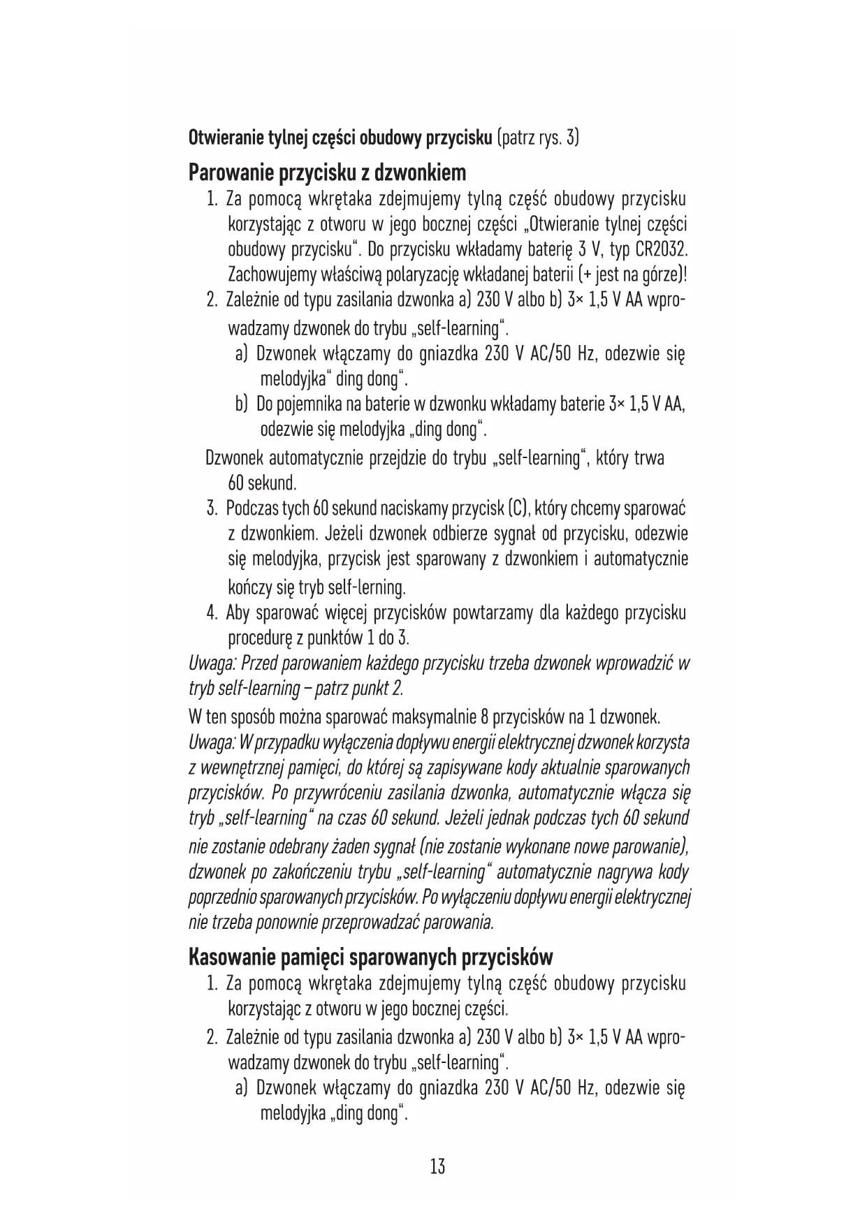 procedurę z punktów 1 do 3. Uwaga: Przed parowaniem każdego przycisku trzeba dzwonek wprowadzić w tryb self-learning – patrz punkt 2. W ten sposób można sparować maksymalnie 8 przycisków na 1 dzwonek. Uwaga: W przypadku wyłączenia dopływu energii elektrycznej dzwonek korzysta z wewnętrznej pamięci, do której są zapisywane kody aktualnie sparowanych przycisków. Po przywróceniu zasilania dzwonka, automatycznie włącza się tryb „self-learning“ na czas 60 sekund. Jeżeli jednak podczas tych 60 sekund nie zostanie odebrany żaden sygnał (nie zostanie wykonane nowe parowanie), dzwonek po zakończeniu trybu „self-learning“ automatycznie nagrywa kody poprzednio sparowanych przycisków. Po wyłączeniu dopływu energii elektrycznej nie trzeba ponownie przeprowadzać parowania. Kasowanie pamięci sparowanych przycisków