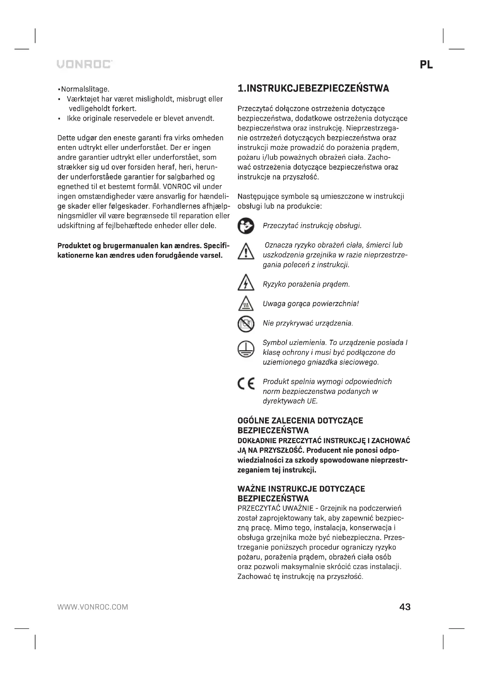 BEZPIECZEŃSTWA PRZECZYTAĆ UWAŻNIE - Grzejnik na podczerwień został zaprojektowany tak, aby zapewnić bezpiec- zną pracę. Mimo tego, instalacja, konserwacja i obsługa grzejnika może być niebezpieczna. Przes- trzeganie poniższych procedur ograniczy ryzyko pożaru, porażenia prądem, obrażeń ciała osób oraz pozwoli maksymalnie skrócić czas instalacji. Zachować tę instrukcję na przyszłość.44
