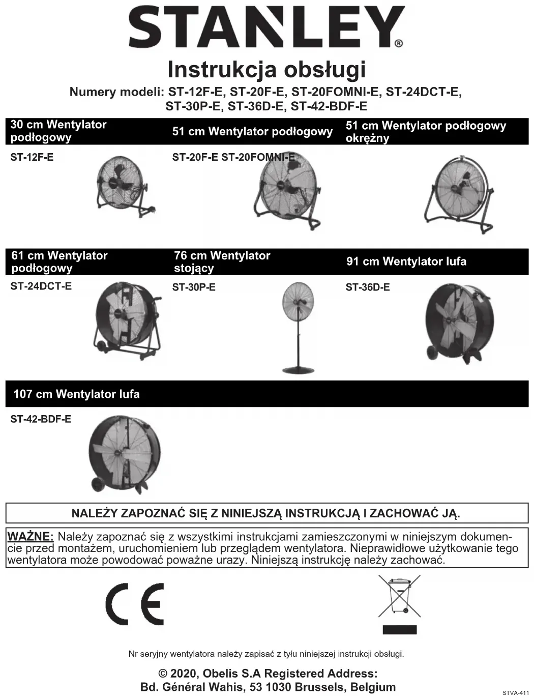 REPNr seryjny wentylatora należy zapisać z tyłu niniejszej instrukcji obsługi. NALEŻY ZAPOZNAĆ SIĘ Z NINIEJSZĄ INSTRUKCJĄ I ZACHOWAĆ JĄ. WAŻNE: Należy zapoznać się z wszystkimi instrukcjami zamieszczonymi w niniejszym dokumen- cie przed montażem, uruchomieniem lub przeglądem wentylatora. Nieprawidłowe użytkowanie tego wentylatora może powodować poważne urazy. Niniejszą instrukcję należy zachować. Numery modeli: ST-12F-E, ST-20F-E, ST-20FOMNI-E, ST-24DCT-E,