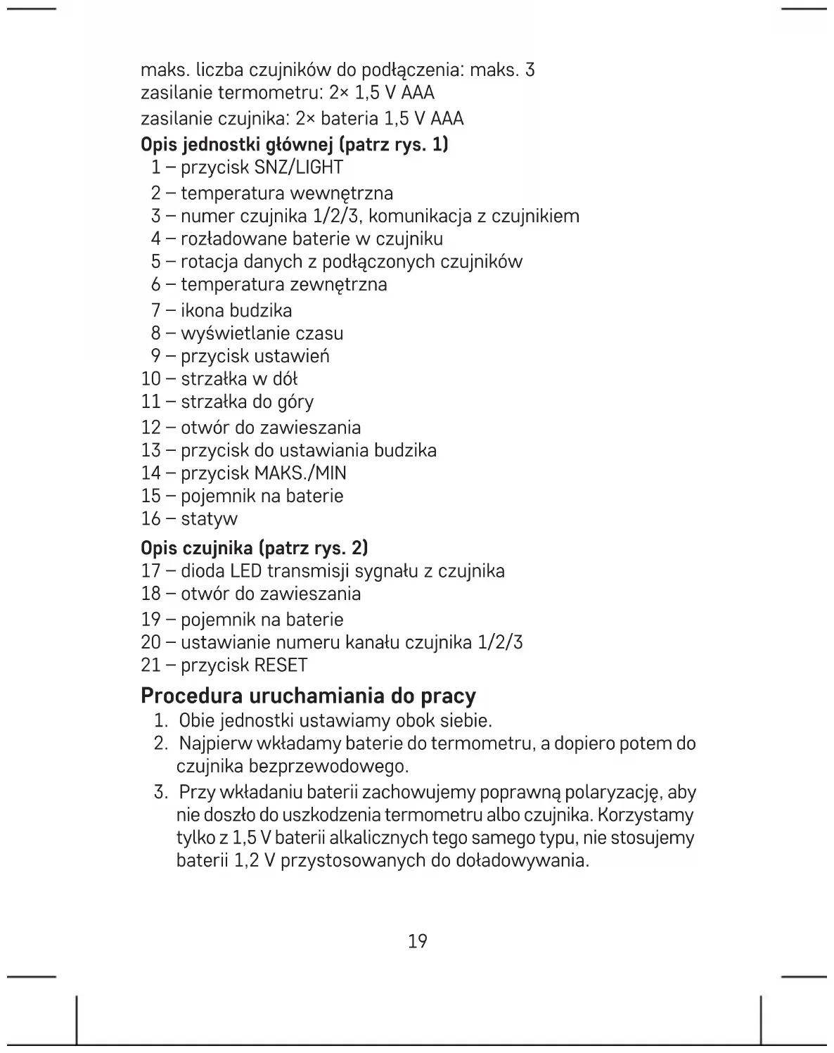 nie doszło do uszkodzenia termometru albo czujnika. Korzystamy tylko z 1,5 V baterii alkalicznych tego samego typu, nie stosujemy baterii 1,2 V przystosowanych do doładowywania.20