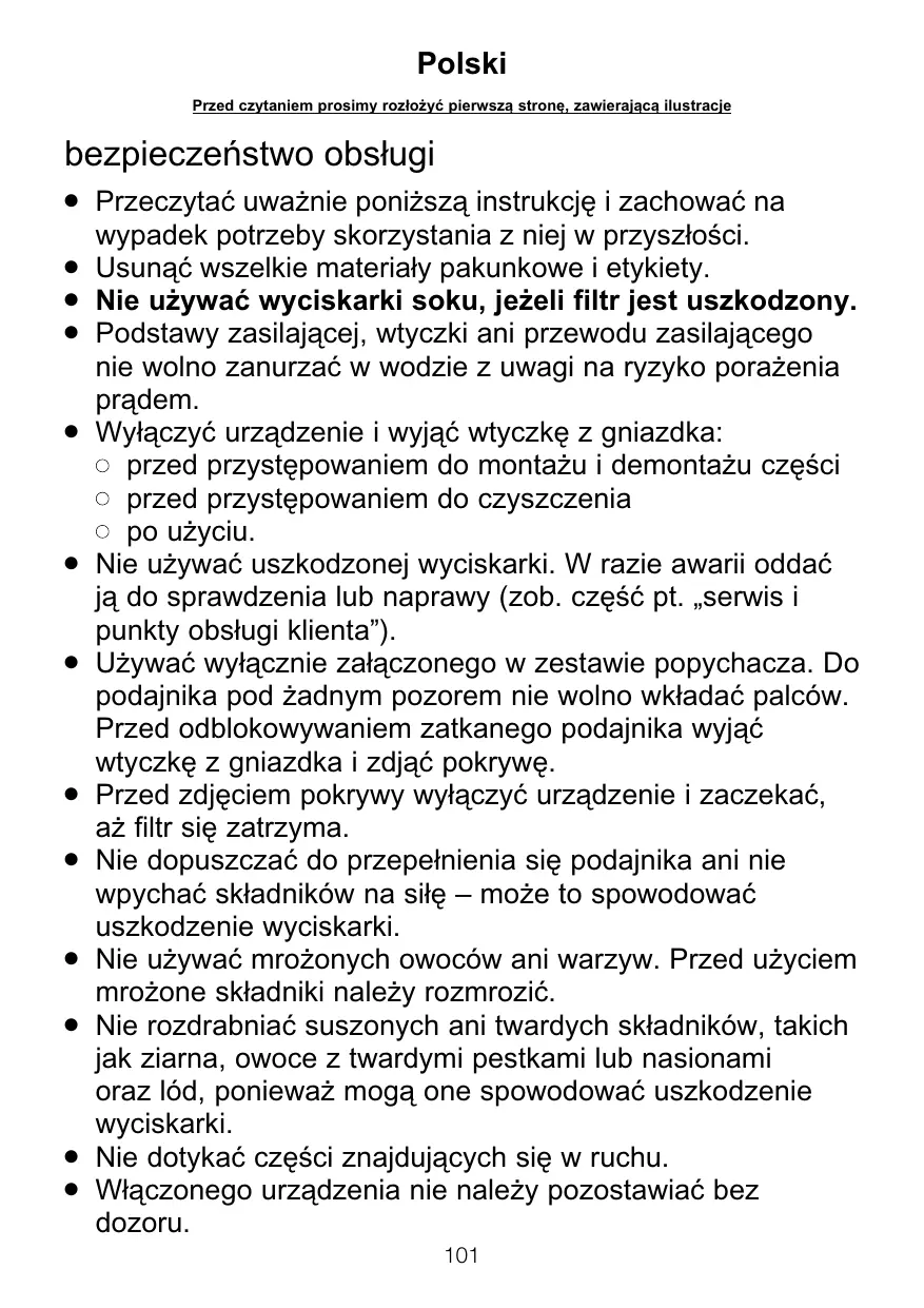 Przeczytać uważnie poniższą instrukcję i zachować na wypadek potrzeby skorzystania z niej w przyszłości. Usunąć wszelkie materiały pakunkowe i etykiety. Nie używać wyciskarki soku, jeżeli filtr jest uszkodzony. Podstawy zasilającej, wtyczki ani przewodu zasilającego nie wolno zanurzać w wodzie z uwagi na ryzyko porażenia prądem. Wyłączyć urządzenie i wyjąć wtyczkę z gniazdka: przed przystępowaniem do montażu i demontażu części przed przystępowaniem do czyszczenia po użyciu. Nie używać uszkodzonej wyciskarki. W razie awarii oddać ją do sprawdzenia lub naprawy (zob. część pt. „serwis i punkty obsługi klienta”). Używać wyłącznie załączonego w zestawie popychacza. Do podajnika pod żadnym pozorem nie wolno wkładać palców. Przed odblokowywaniem zatkanego podajnika wyjąć wtyczkę z gniazdka i zdjąć pokrywę. Przed zdjęciem pokrywy wyłączyć urządzenie i zaczekać, aż filtr się zatrzyma. Nie dopuszczać do przepełnienia się podajnika ani nie wpychać składników na siłę – może to spowodować uszkodzenie wyciskarki. Nie używać mrożonych owoców ani warzyw. Przed użyciem mrożone składniki należy rozmrozić. Nie rozdrabniać suszonych ani twardych składników, takich jak ziarna, owoce z twardymi pestkami lub nasionami oraz lód, ponieważ mogą one spowodować uszkodzenie wyciskarki. Nie dotykać części znajdujących się w ruchu. Włączonego urządzenia nie należy pozostawiać bez dozoru. 101