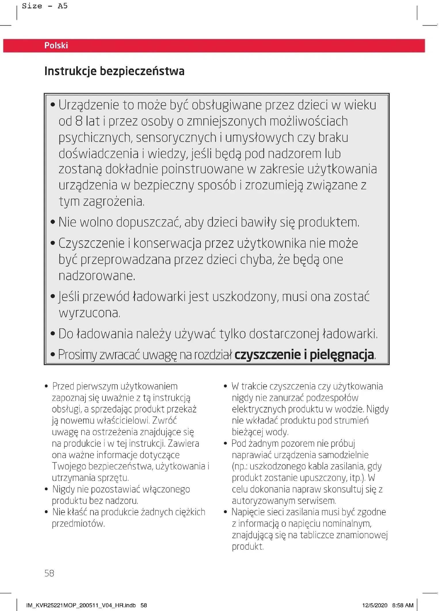 - Napięcie sieci zasilania musi być zgodne z informacją o napięciu nominalnym, znajdującą się na tabliczce znamionowej produkt. IM_KVR25221MOP_200511_V04_HR.indb 58IM_KVR25221MOP_200511_V04_HR.indb 58 12/5/2020 8:58 AM12/5/2020 8:58 AMPolski